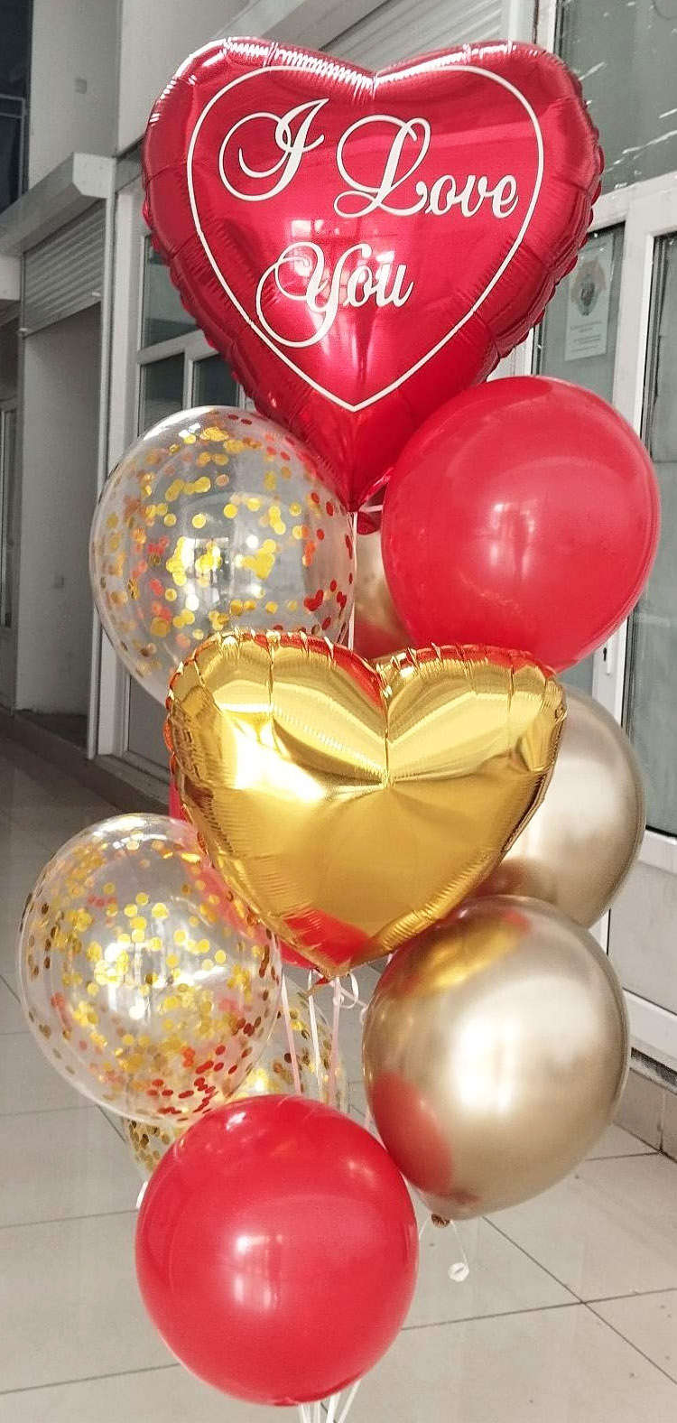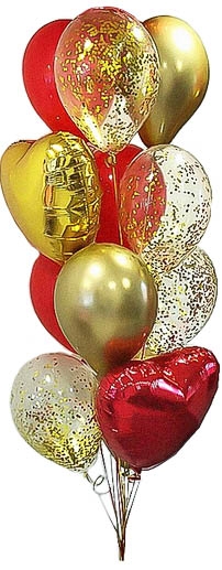 This is arrangement - combination of gel latex ballons and a large foil hearts. Colors are red and golden.