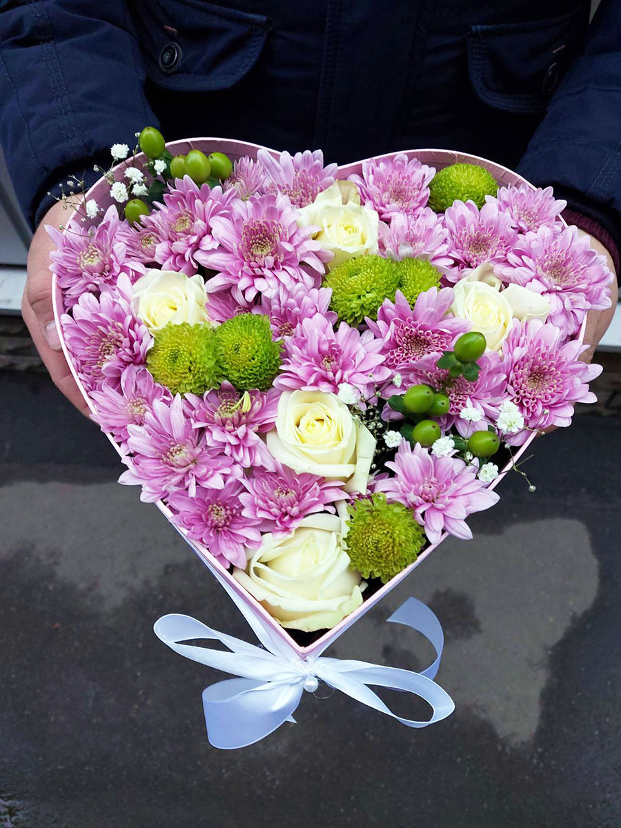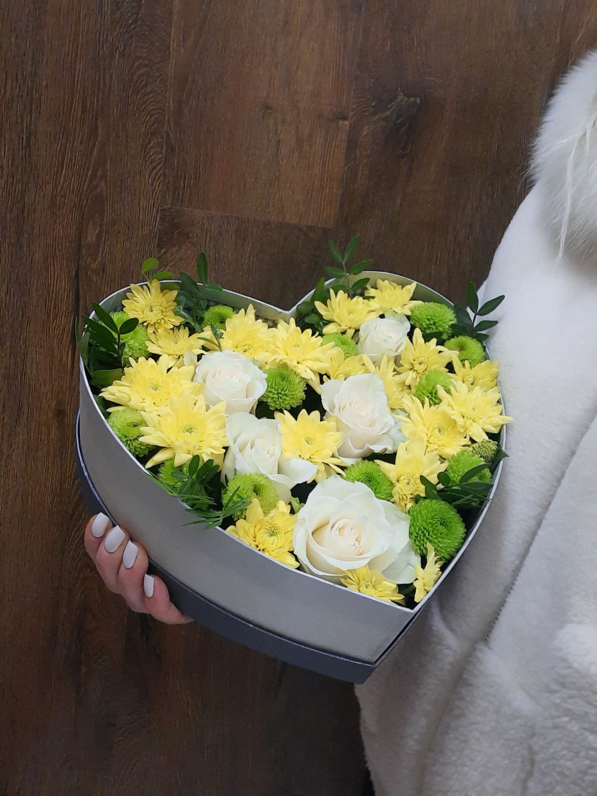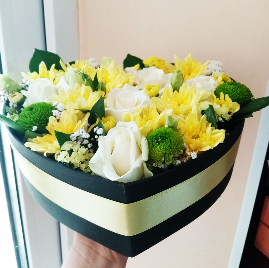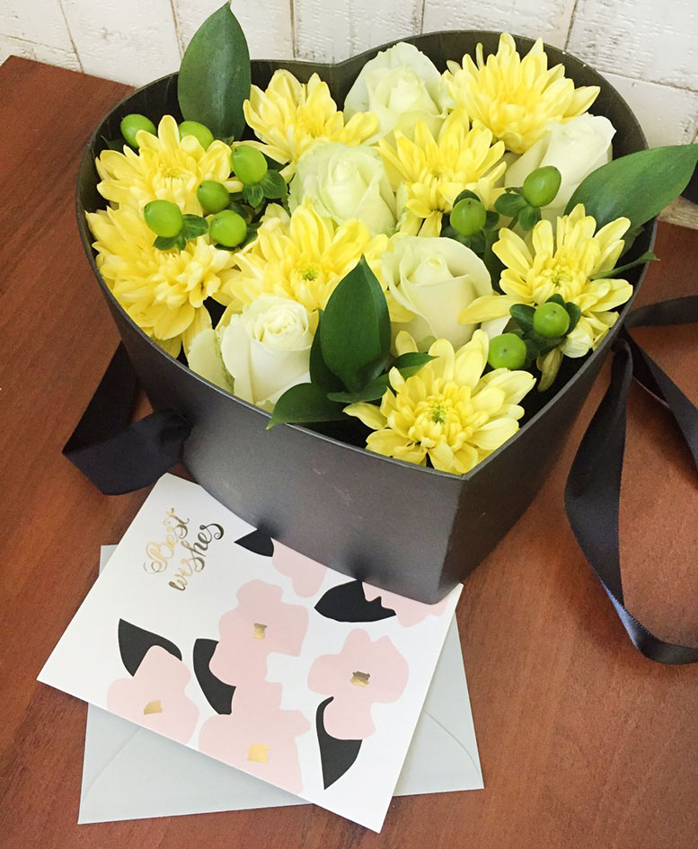 This gift box has 5 white roses and 3 yellow chrysanthemums