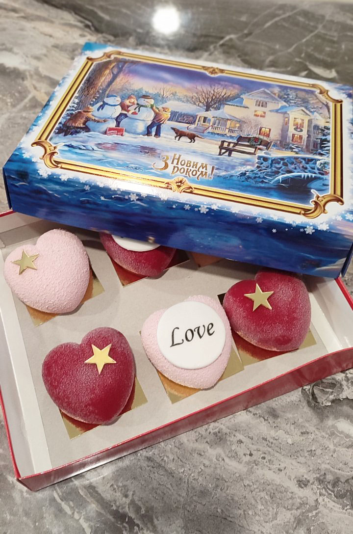 A box with 6 assorted mini cakes, 80-100 grams each.