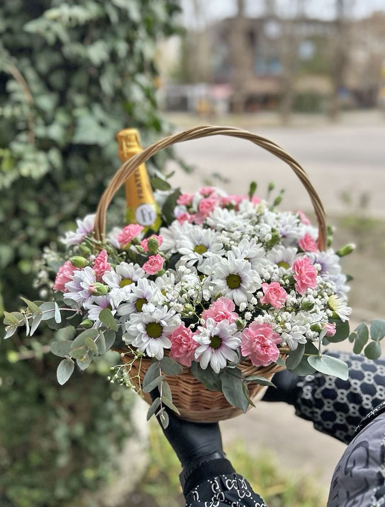 A charming basket has combined the subtle fragrance of pink carnations and the delightful flavour of sweet champagne. This is a good combination in all respects. It can be presented both to a lady and to a man!
