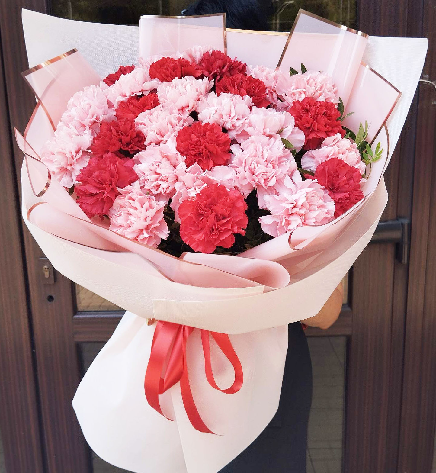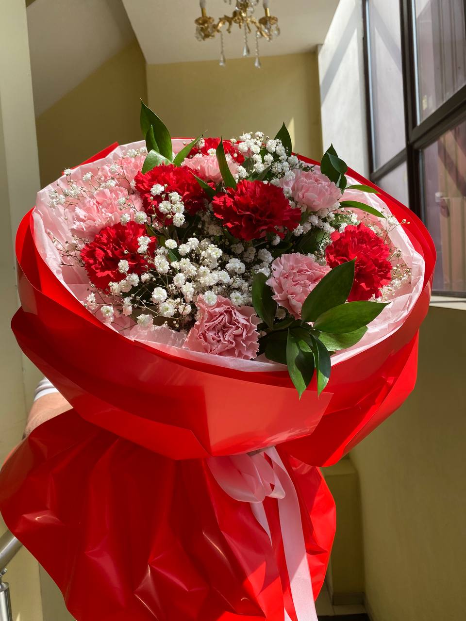 Mix of fresh large red and pink carnations with white gypsophila flowers look so elegant and festively.