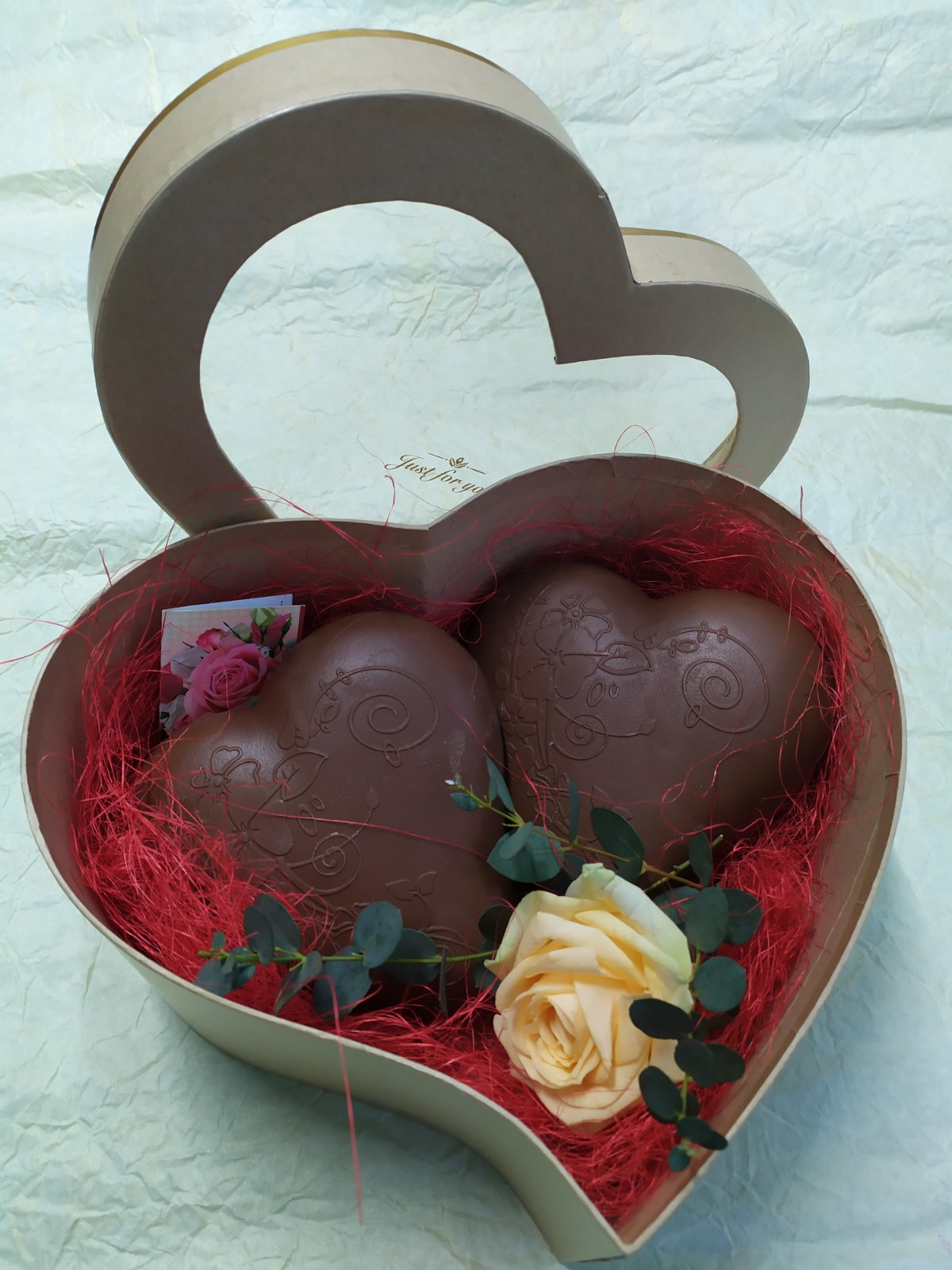 Every heart packed in a transparent package with a ribbon. Then it is set into a twigged tray or into a gift box of appropriate size and festive decoration.