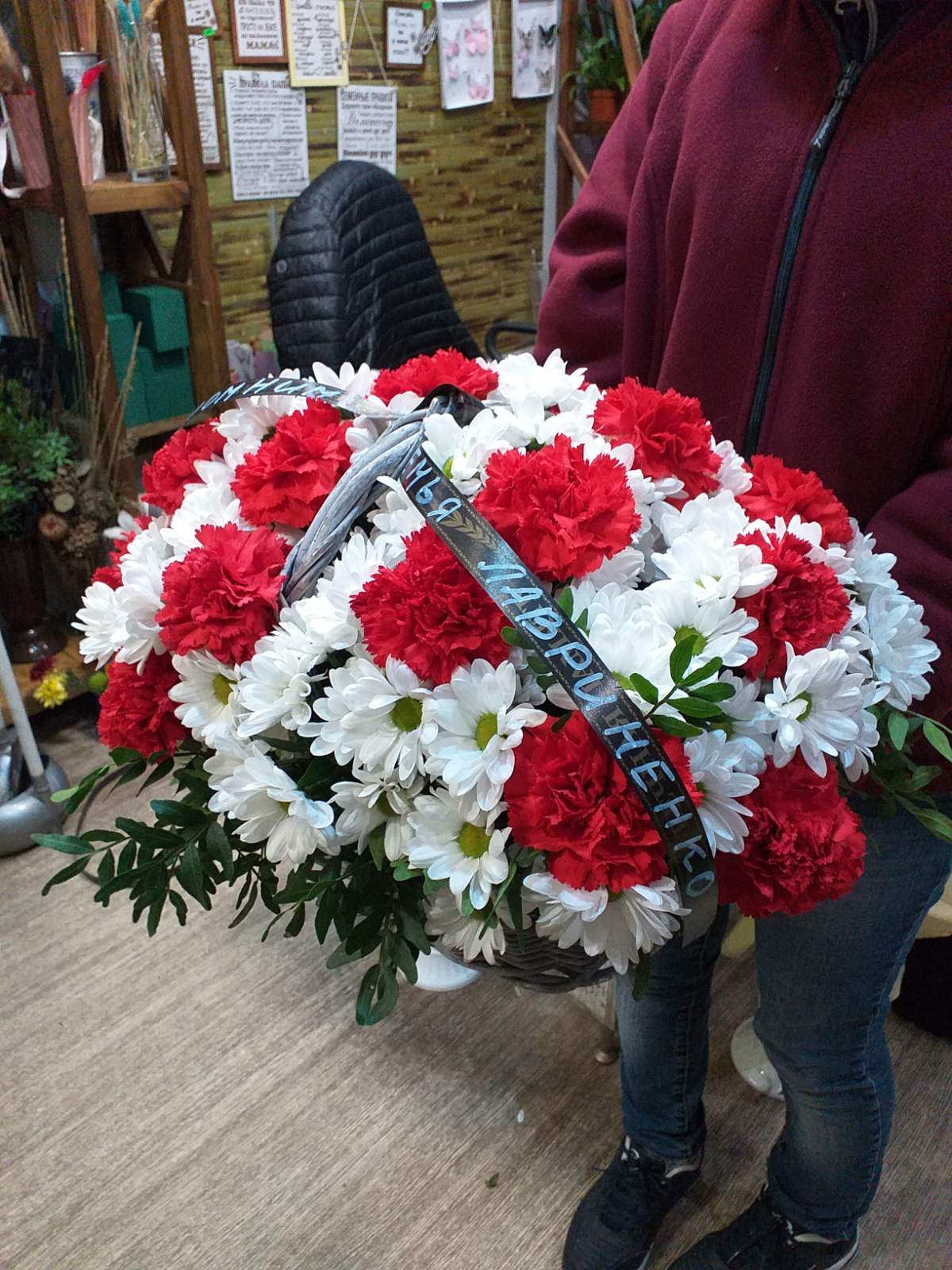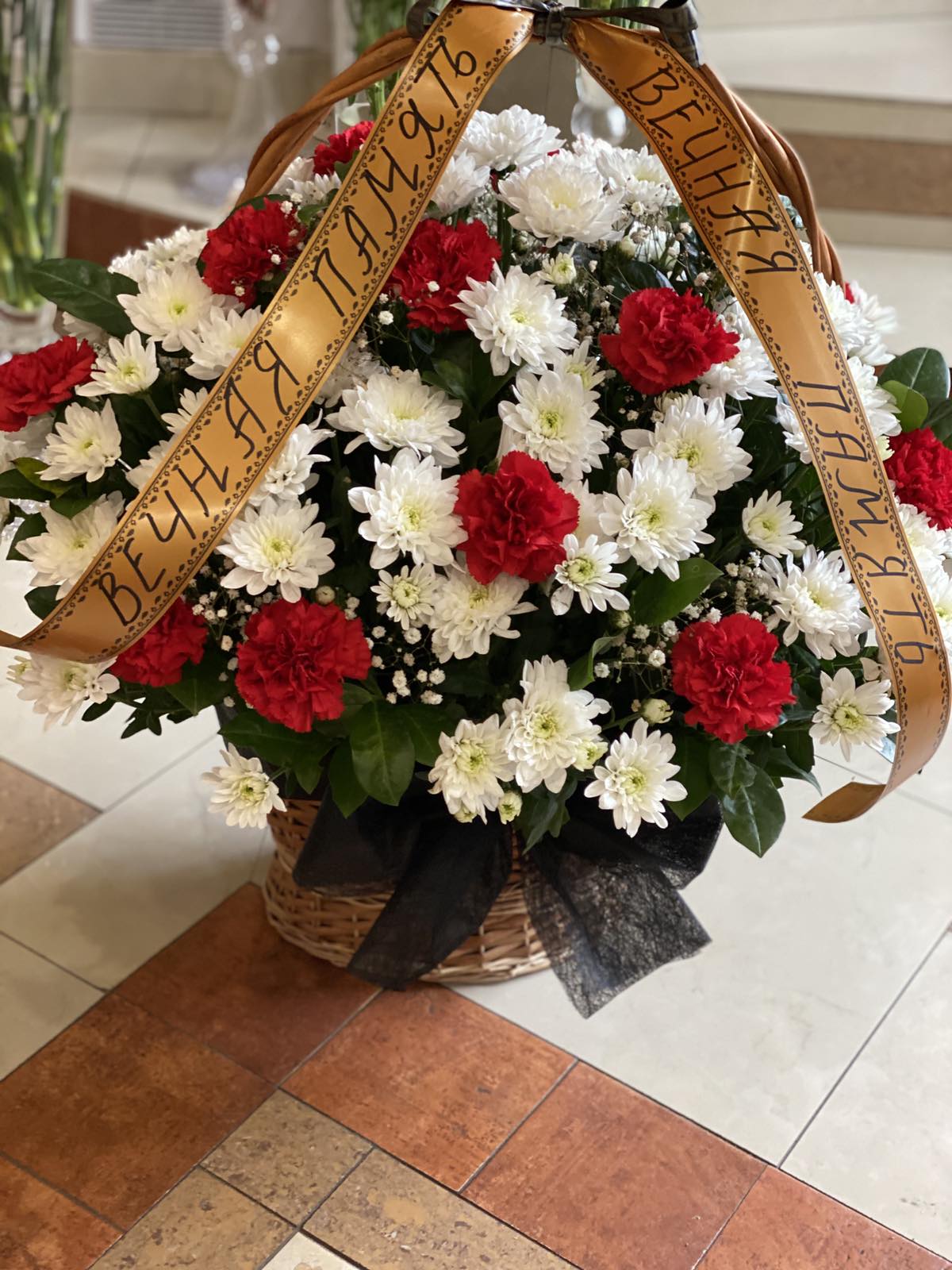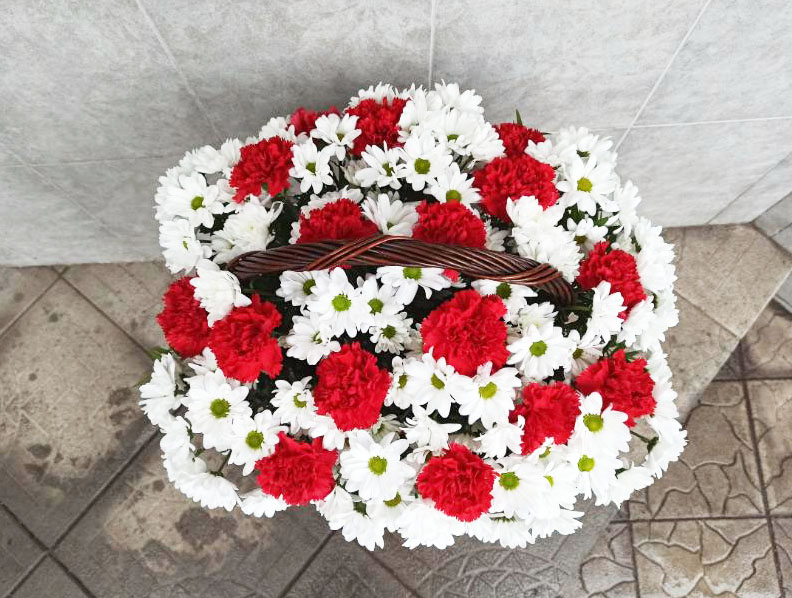 The basket cosists of 16 red carnations and 16 snow white chrysanthemums