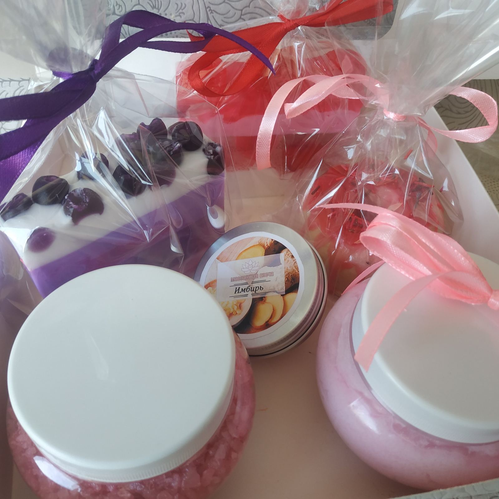 A magnificent handmade cosmetic gift set with nice decoration in a gift box with a bow.