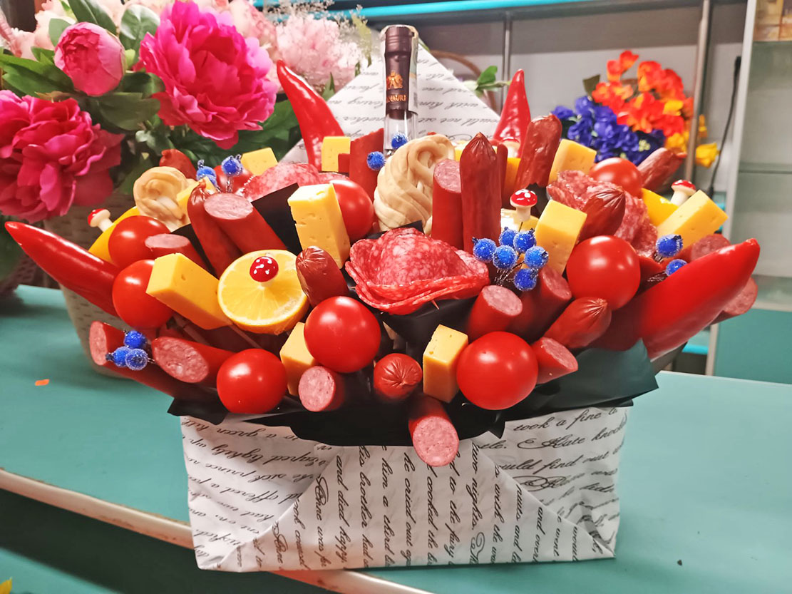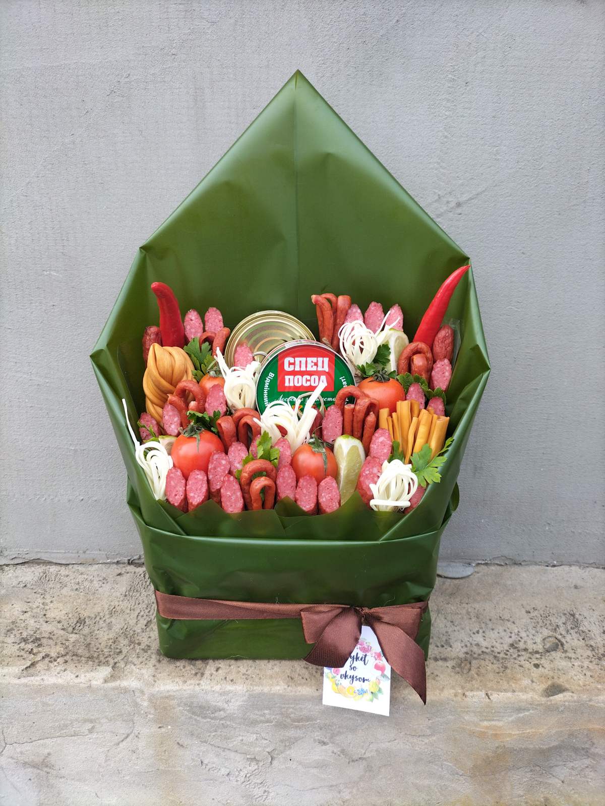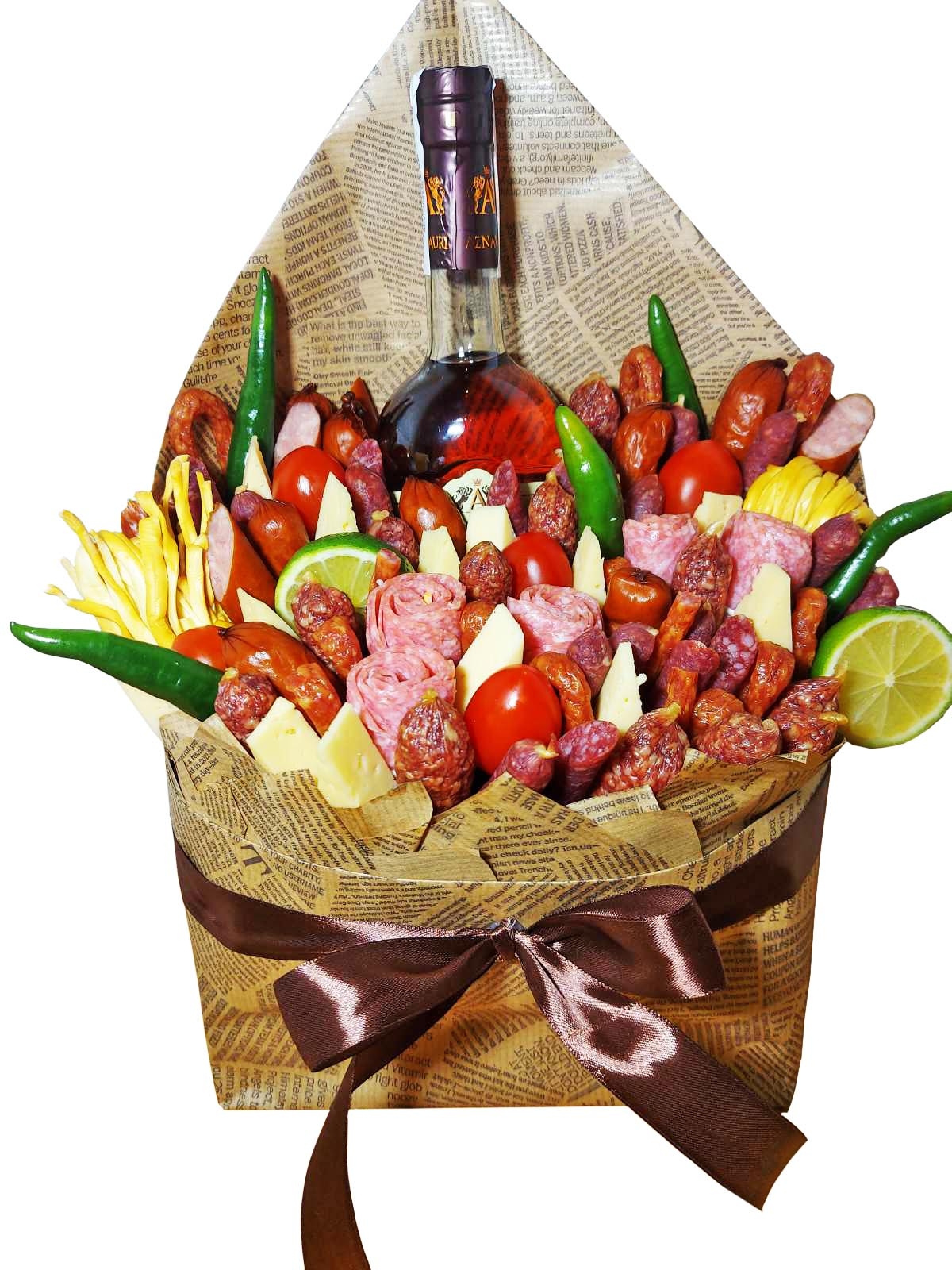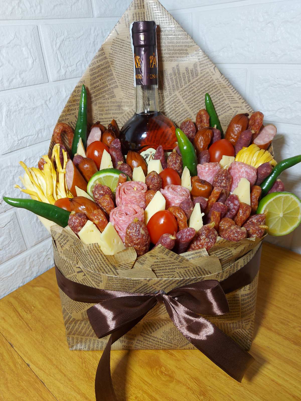 Such envelope with a bottle of Ukraine made cognac of 0,5-0,7 L, cheeses, sausages, peppers, tomatos, lemons is very popular gift for a man of any age. It is funny, looks as a great gift and is a real enjoyment!