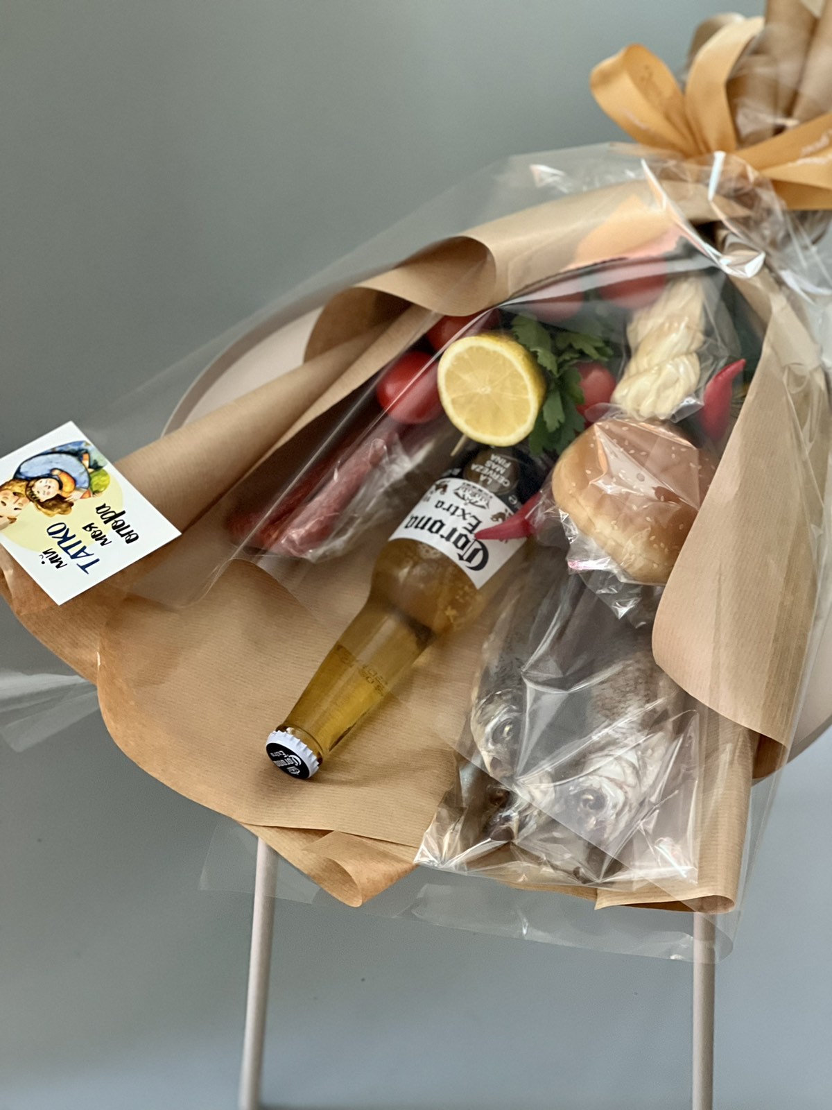 3 fish, cheese, sausage, pepper, lemon, beer.
