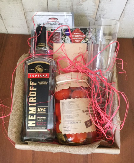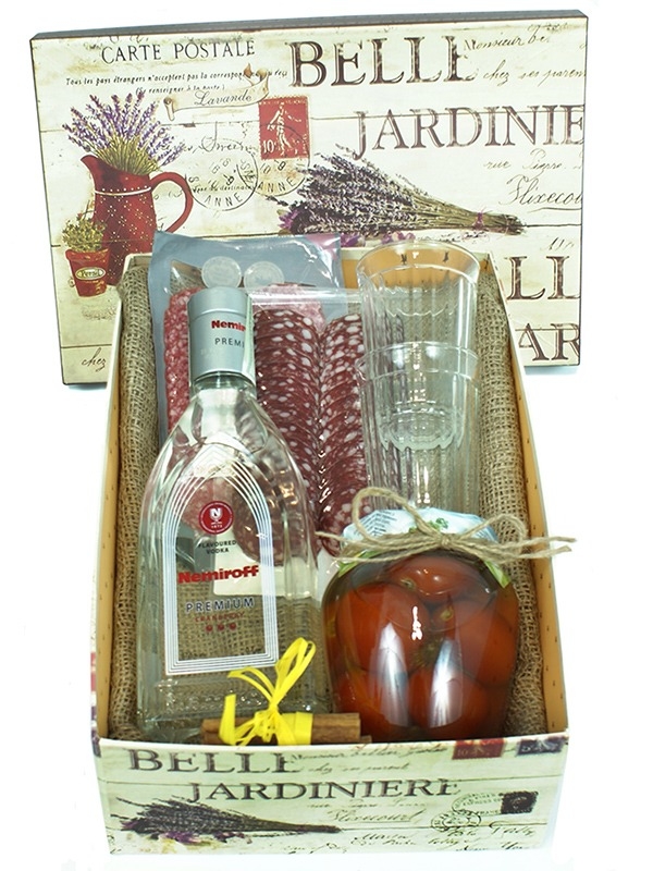 1 x bottle of Vodka Nemiroff Premium, 0.7 L 2 x faceted glasses as a reminder of a far past 1 x sausage boiled-smoked, sliced, 100 gr. 1 x sausage smoked, sliced, 100 gr. 1 х Jar of pickled tomatoes