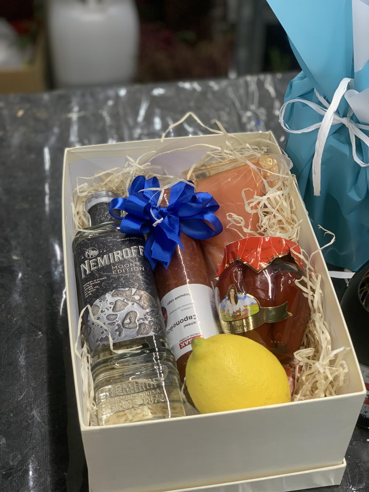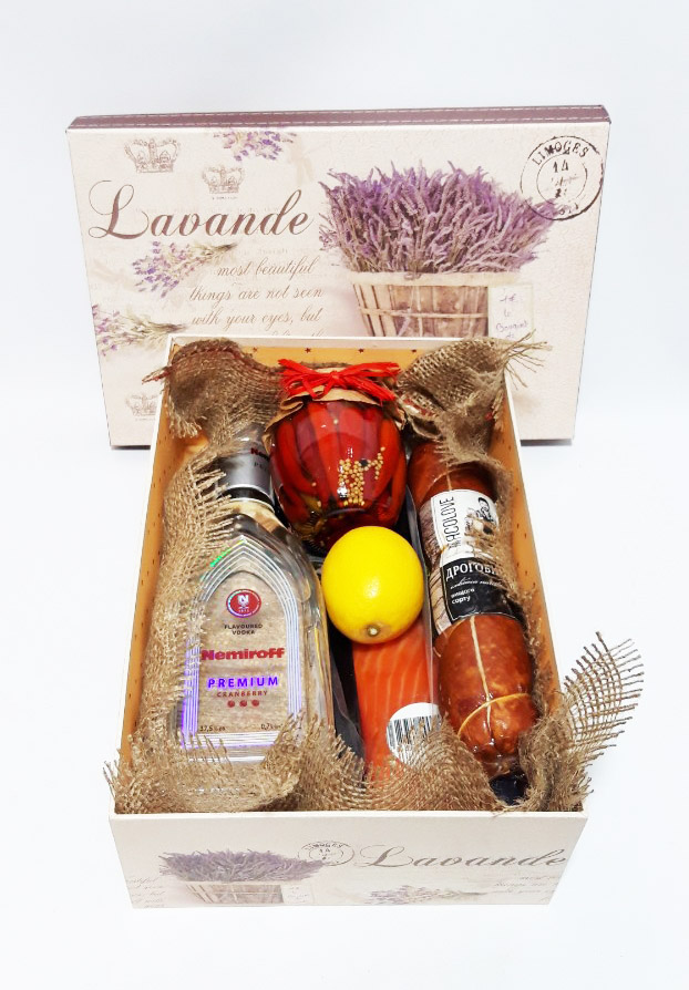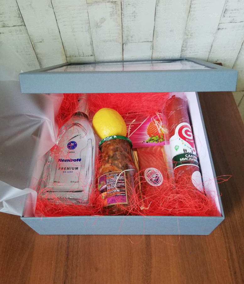 1 х bottle of Vodka Nemiroff Premium, 0.7 L 1 х sausage boiled-smoked, 500 gr. Salmon 200-250 gr 1 x lemon 1 x jar of pickled pepper or cucumber or tomatoes