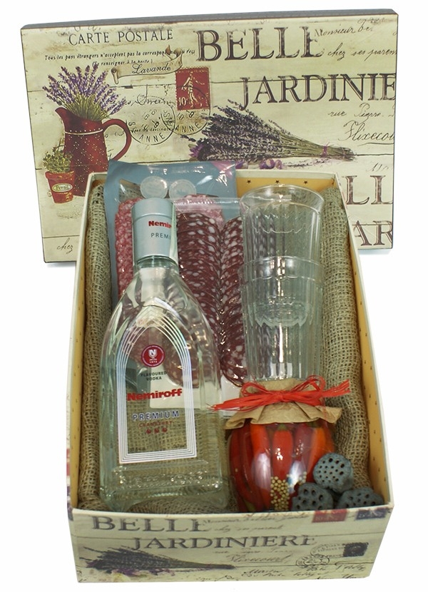1 x bottle of Vodka Nemiroff Premium, 0.7 L 2 x faceted glasses as a reminder of a far past 1 х Sausage boiled-smoked, sliced, 100 gr. 1 х Sausage smoked, sliced, 100 gr. Jar of pickled peppers