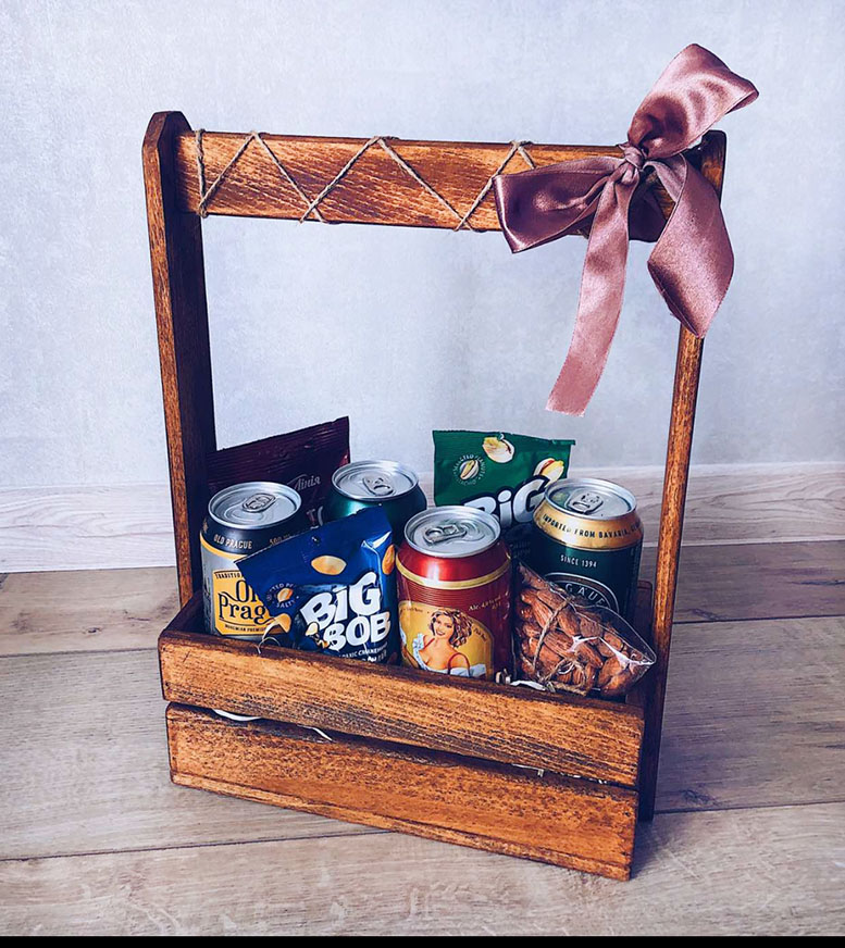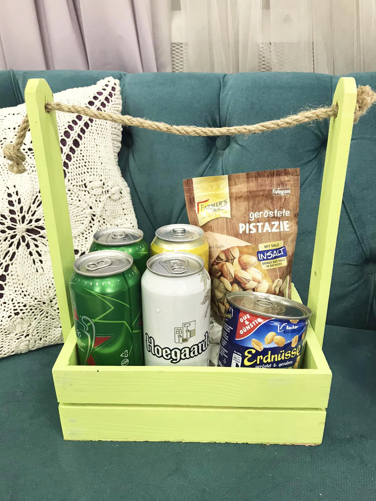 - 4 cans of a good quality Beer - peanuts, almond, pistachios solted - 250 gr total - gift box, decoration