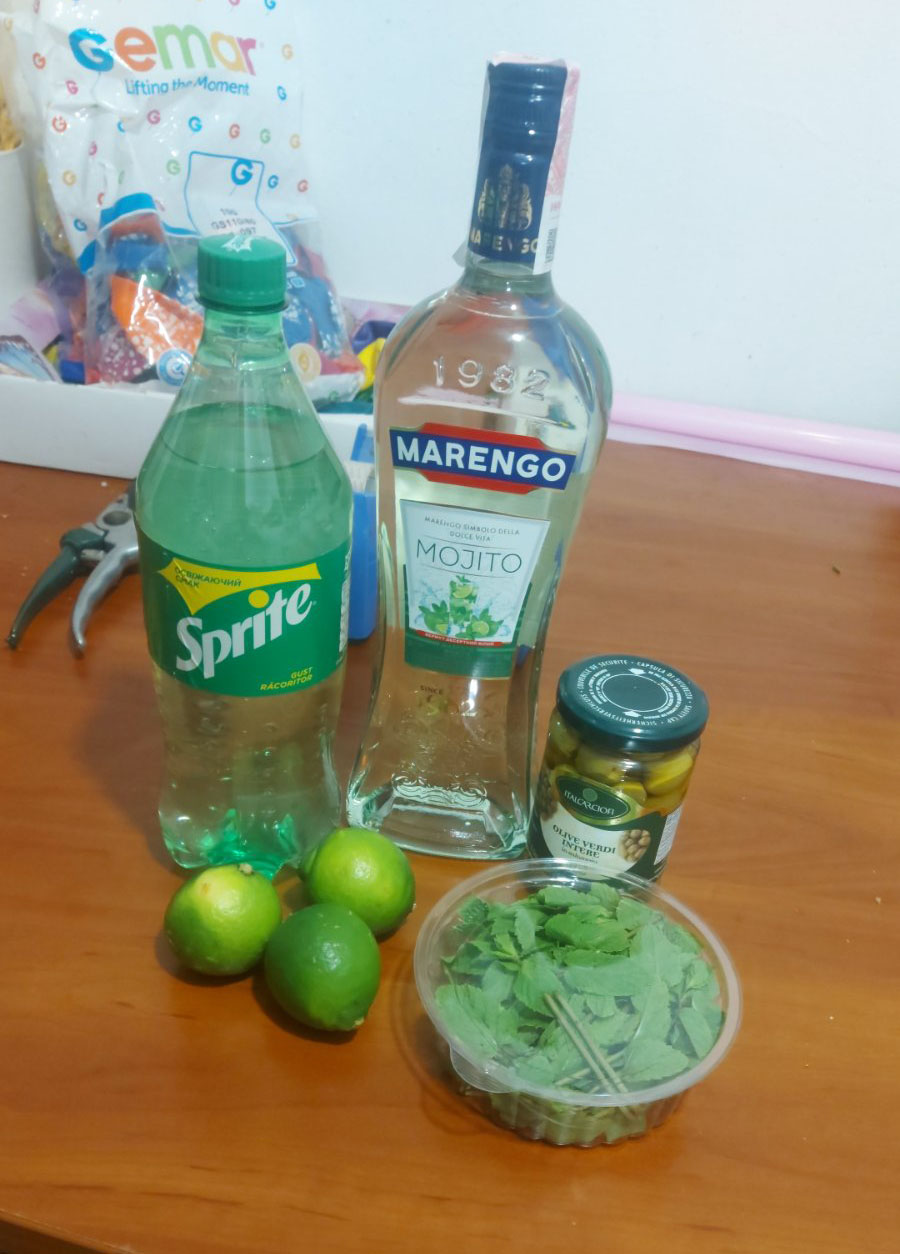 - Lime - Marengo Mojito Vermouth - Sprite - Olivers for snacks - Mint.... there are some nuance regarding this ingredient.