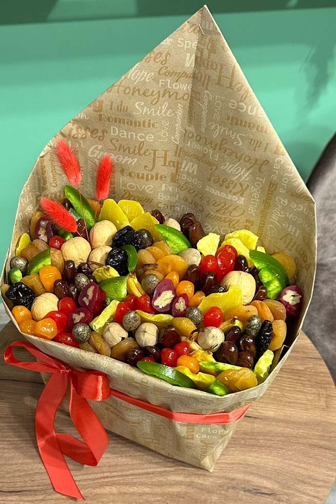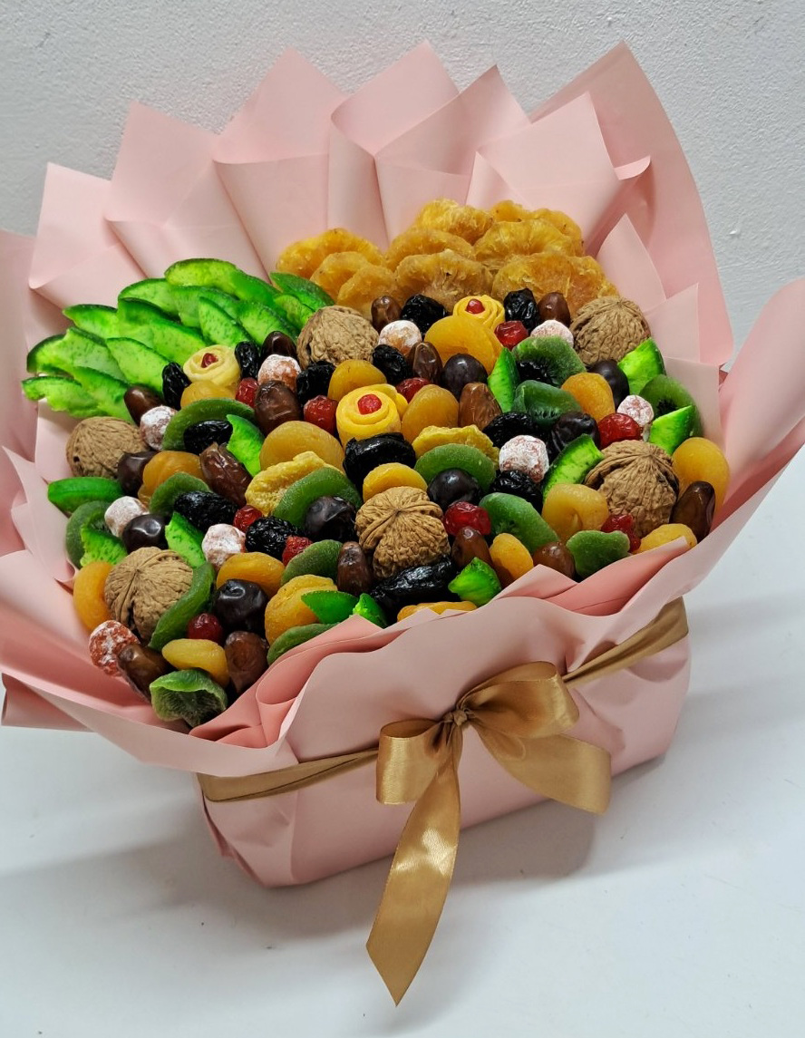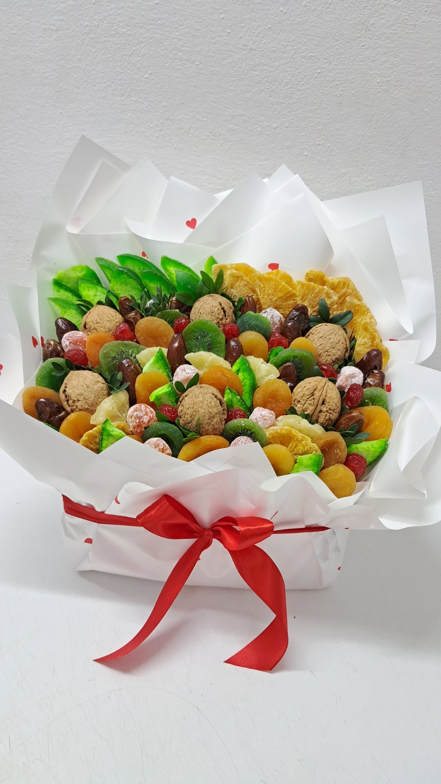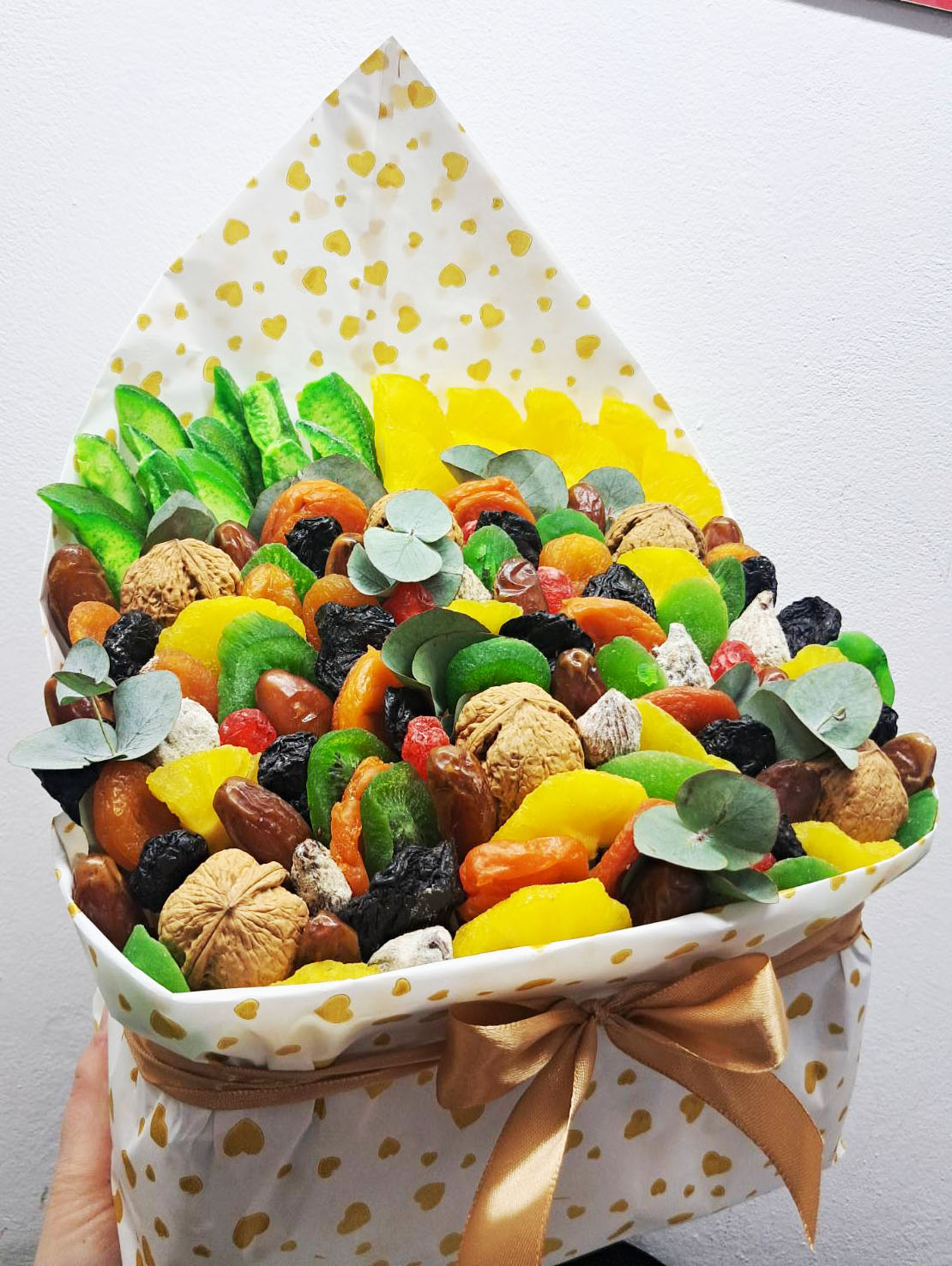 We are a flower shop and all gifts that are NOT flowers require more time for preparation. So, please, order this gift at least 3-4 days prior delivery. This arrangement will be made by its Author - professional Candied fruits designer and mailed to the delivery destination for the personal delivery.