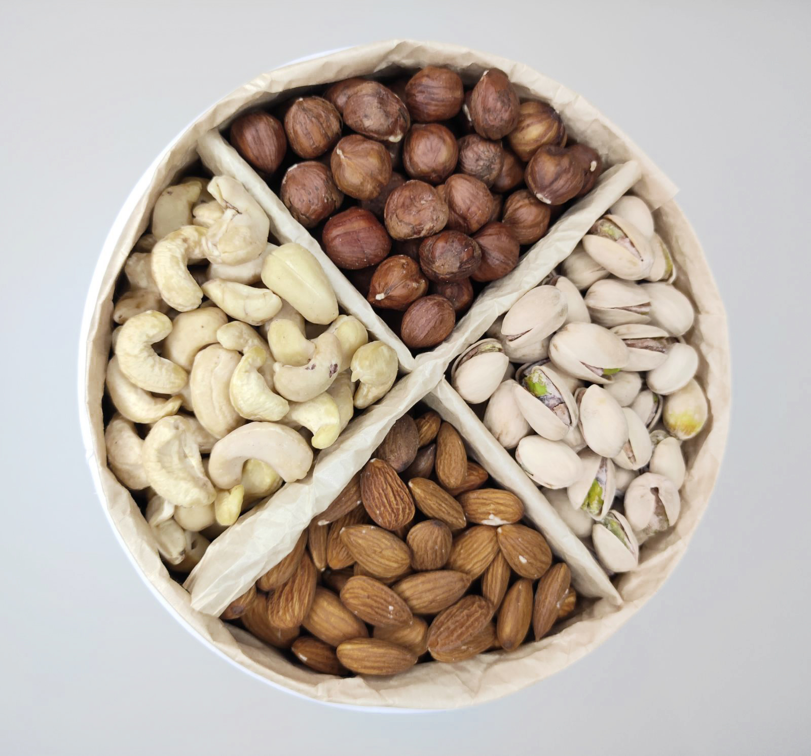 The set of 4 kinds of nuts: hazelnuts, cashews, almonds, pistachios. If so happens that any of the mentioned kinds of nuts is not available at the local shops, we'll substitute it with walnuts.
