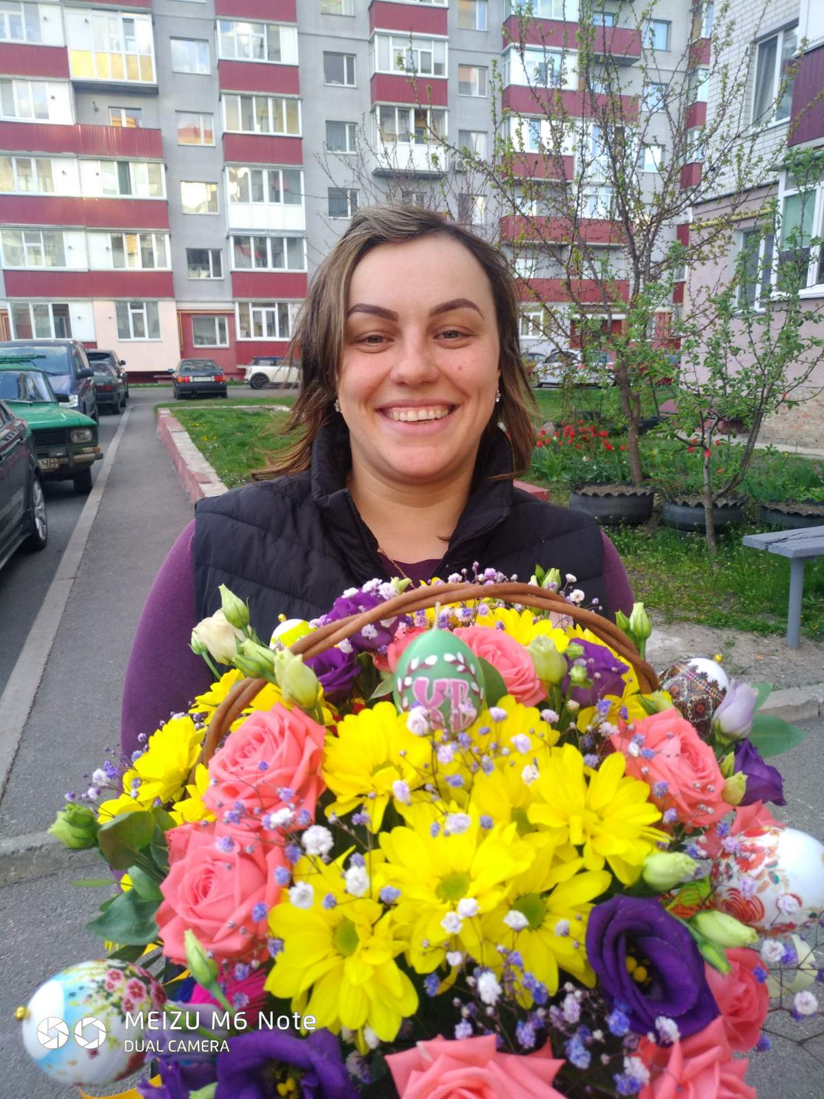 Decorative Easter Eggs among the flowers add the Easter spirit to this arrangement.