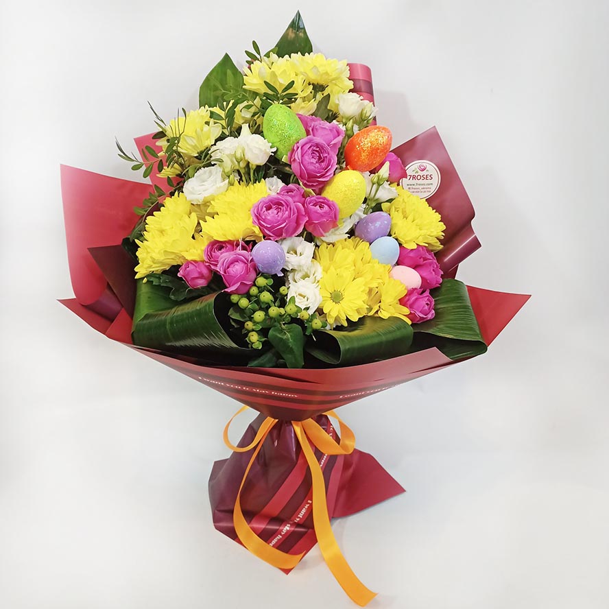 5 x Chrysanthemums yellow 5 x Eustoma white 5 x Bush Roses 7 x decorative Easter eggs