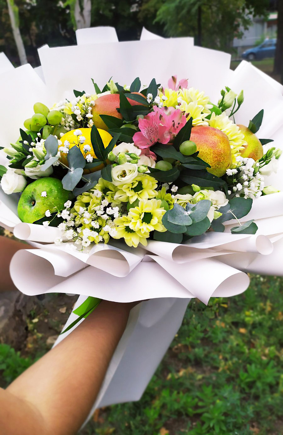 A new trend in floral design - bouquets of flowers with fruits, or citrus.