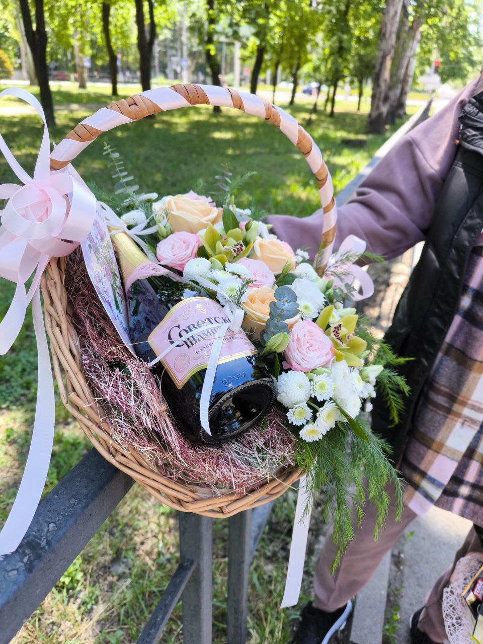 A Gift box with Ukrainian champagne and flowers of the pastel tones: roses, eustoma, foliage.