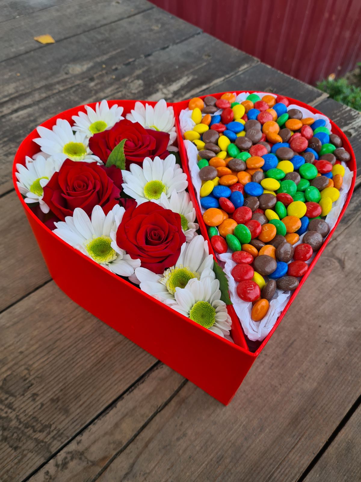 A bright and merry Gift box with red rose (s) and white chrysanthemum dasies with the second half filled with bright candy dots! Here you have green, yellow, blue, red, brown chocolate dragees bringing the atmosphere of a holiday!