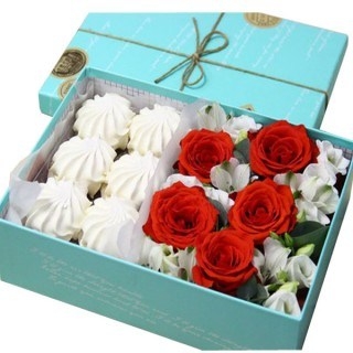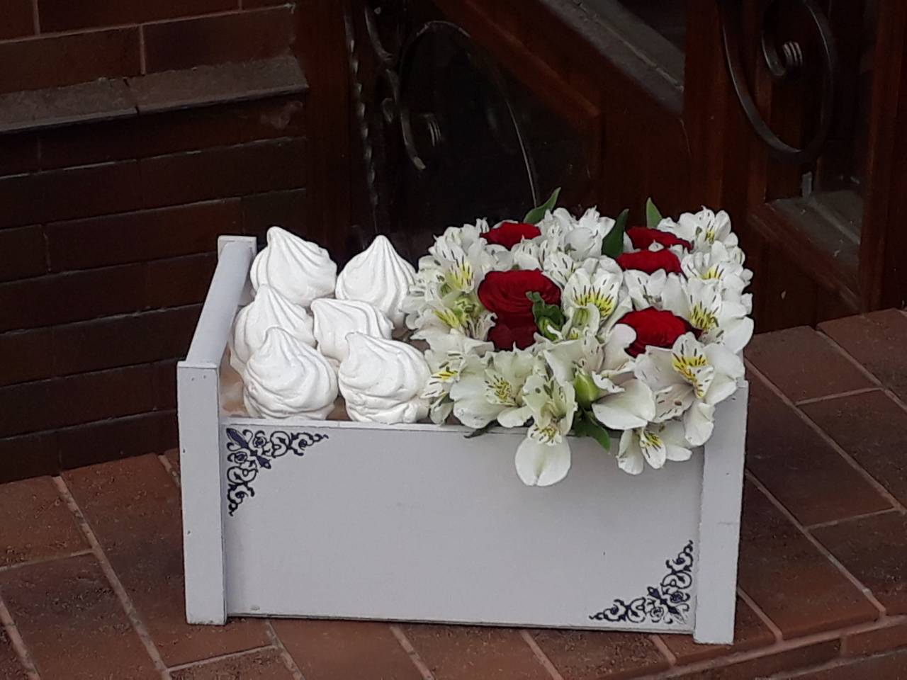 Airy and tasty zephyr in a box with flowers. Extraordinary, unusual, creative gift will be reall pleasure for anyone. Admire the flowers and enjoy the taste of zephyr - is there anything more pleasant?