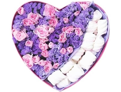 A present box of heart shape with tender flowers and sweet zephyr Marshmallow