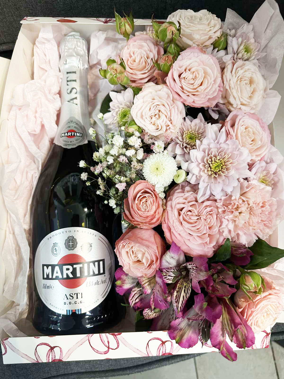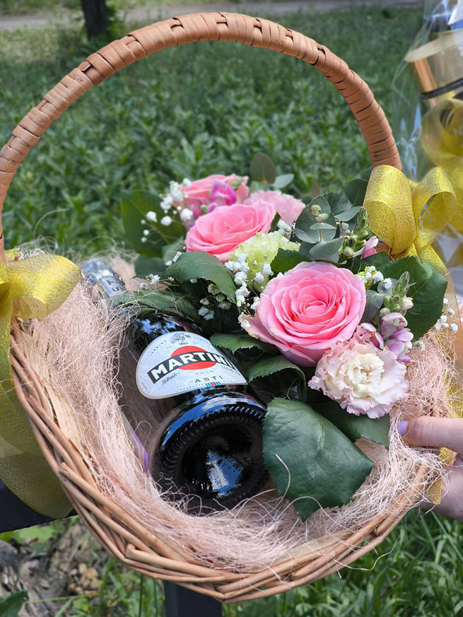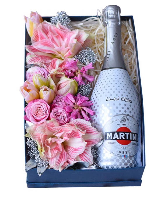 Martini Asti champagne is loved by any one, especially by women of any age. This arrangement of Martini surrounded the beautiful pink flowers is a real masterpiece and a perfect gift at the same time!