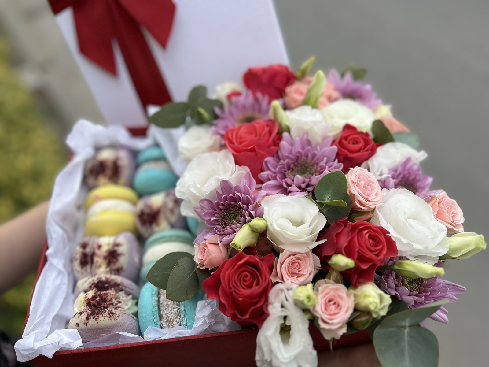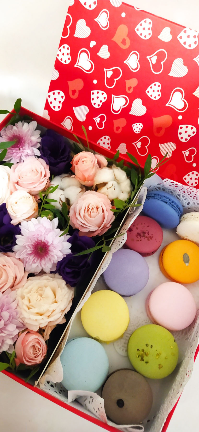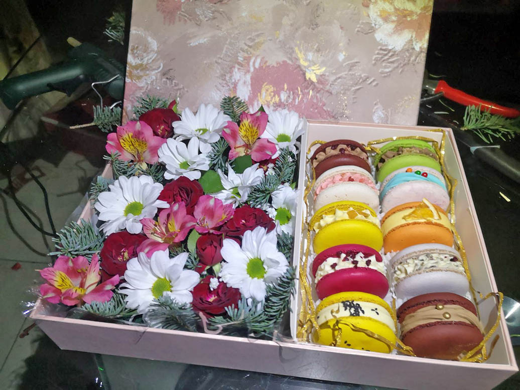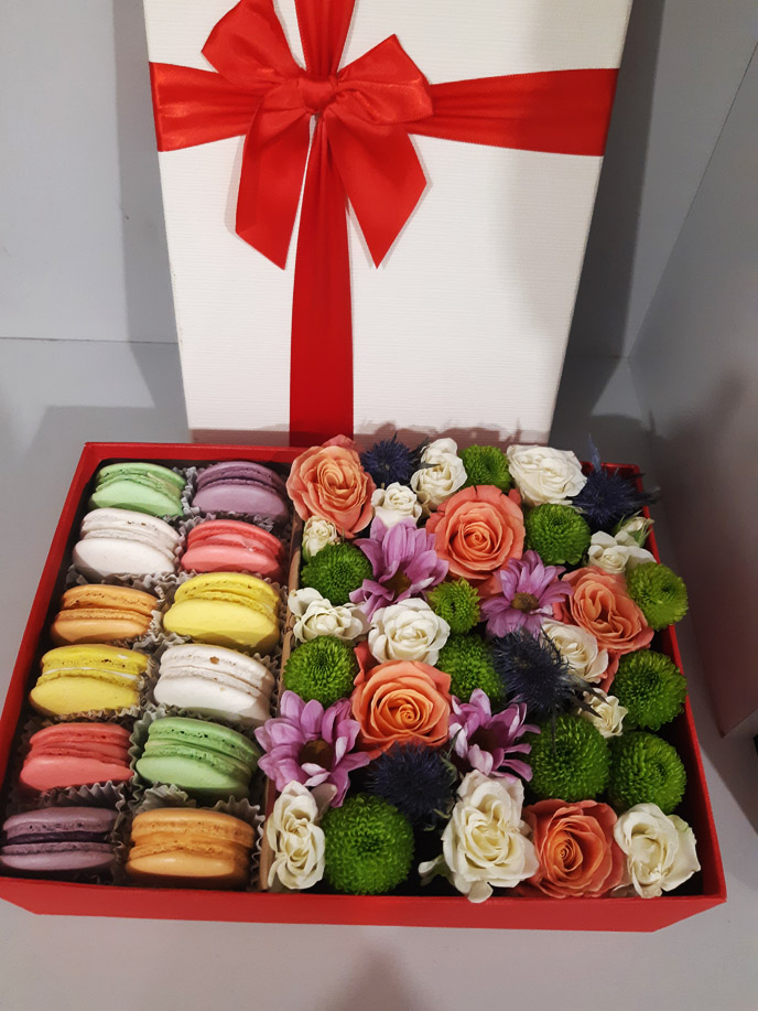 Arrangement of flowers and sweets in a gift-box. Delicious macaroons and bright flowers.