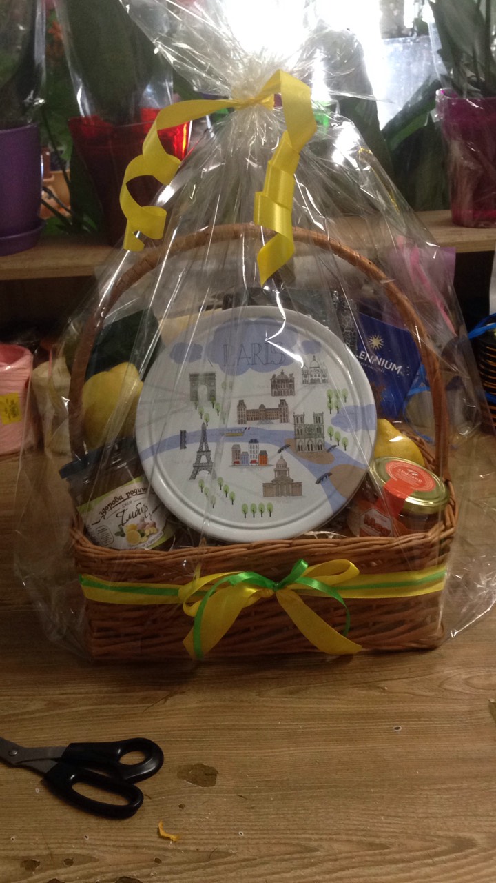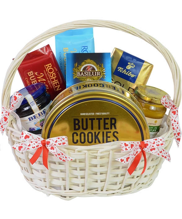 1 x Marvelous Arabica coffee beans, 250 g 1 x Can of Elite black British tea, 225 g 1 x Can of amazing imported cookies 1 x Can of Jam or marmalade 1 x Jar of natural honey 1 x Bar of black chocolate 1 x Bar of white chocolate