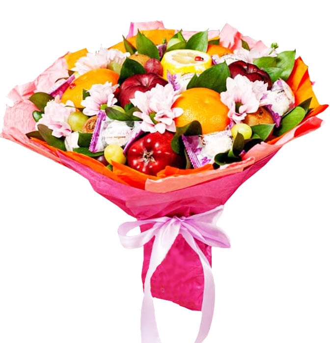 Bright and beautiful gift that includes flowers and apples, oranges, lemons and chocolate candies.