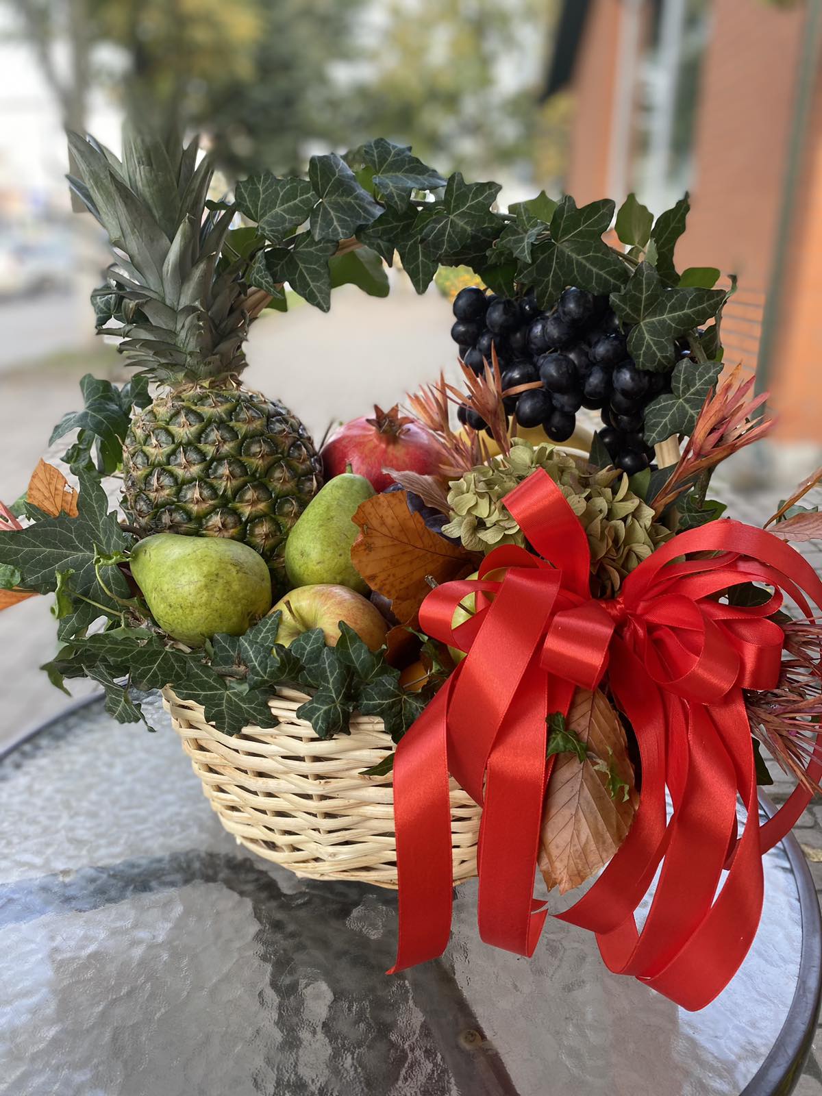 The basket is decorated as a gift: with flowers or bows and nicely packed before presentation.