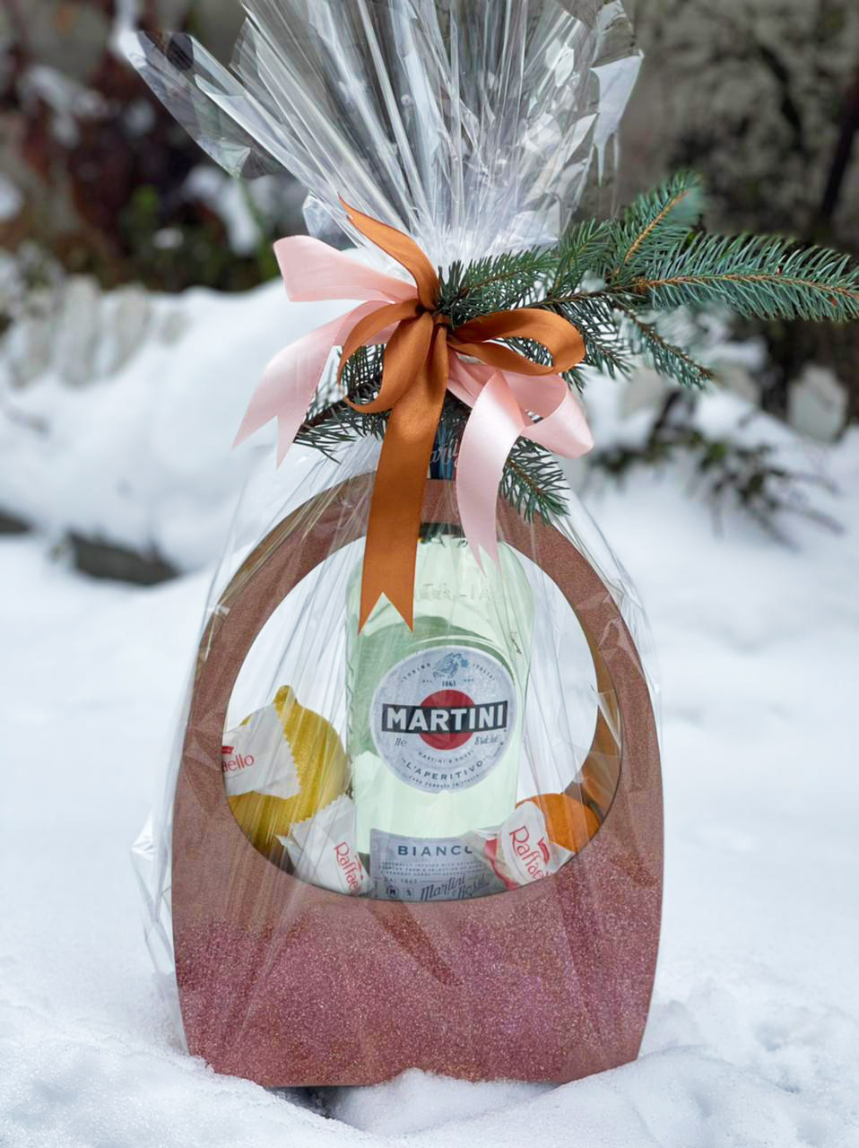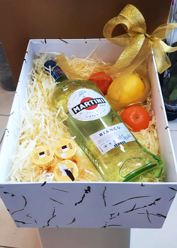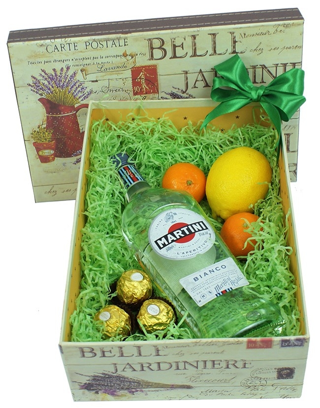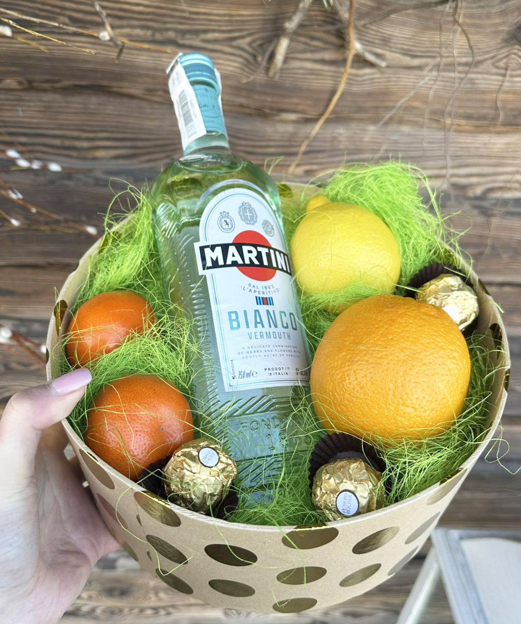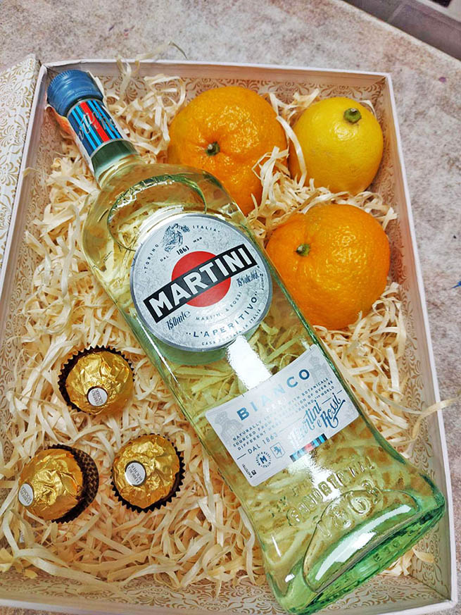 1 x Bottle of Martini Bianko 0,75 l 3 x Ferrero Rocher candies 1 x lemon 2 x mandarins or orangers gift box, decoration.