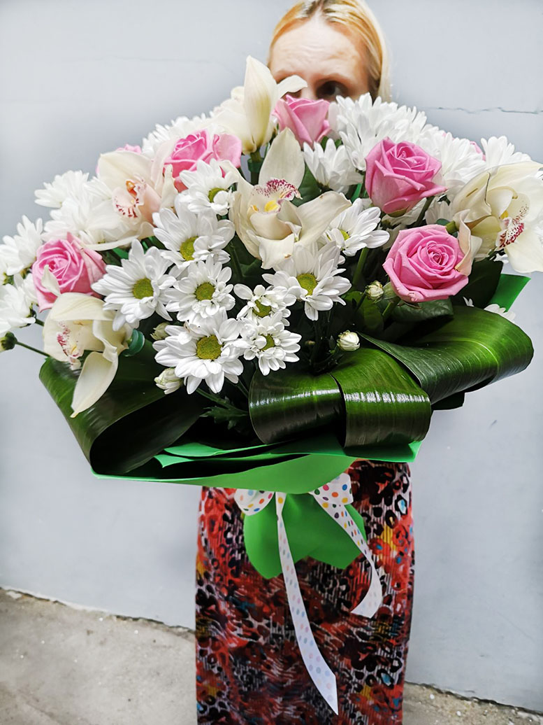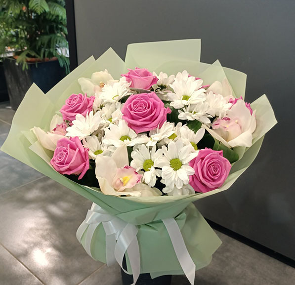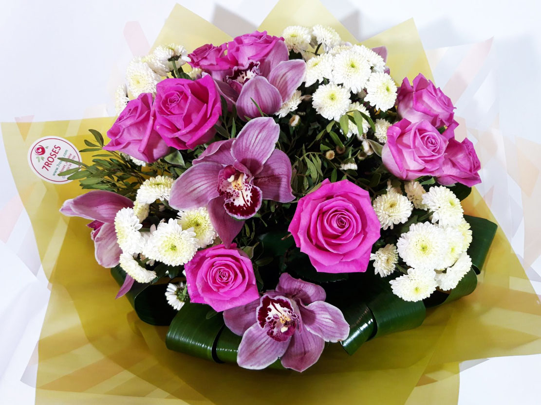 This bouquet consists of 3 orchids which stems are put in so-called capsules so that to keep them fresh for a long time, up to a month! This bouquet also includes 7 pink roses and 5 white chrysanthemums.