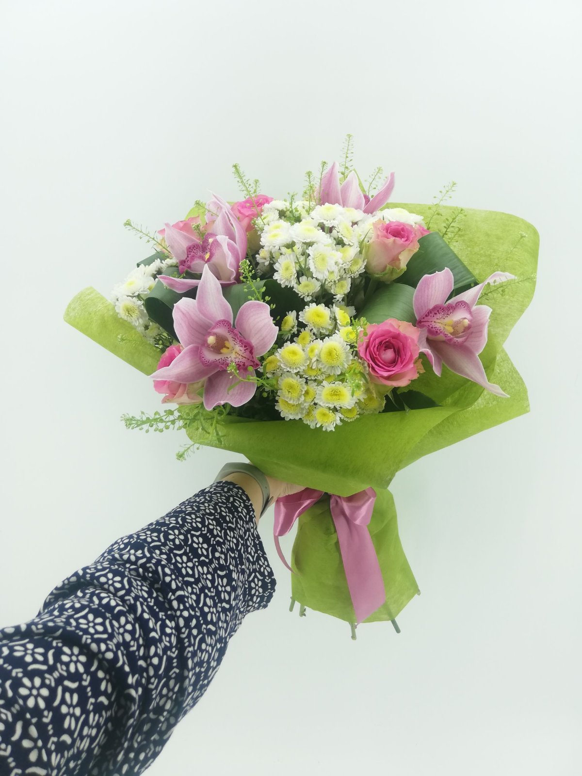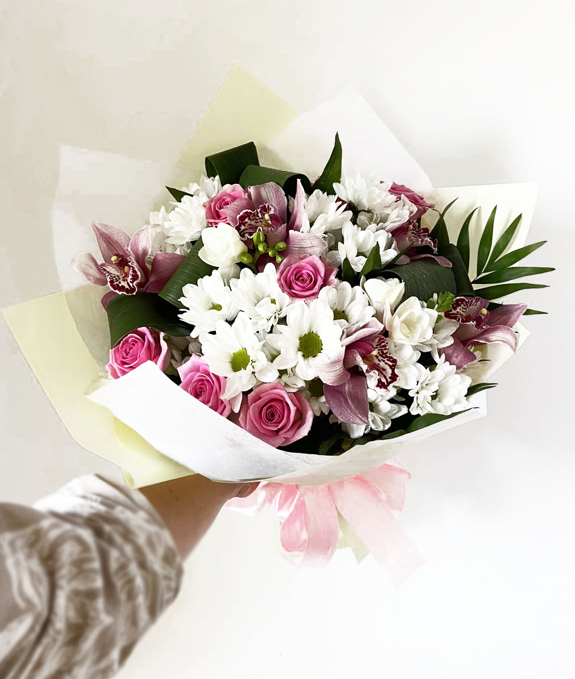 3 x White or Pink Orchids 7 x Pink roses 5 x White chrysanthemums