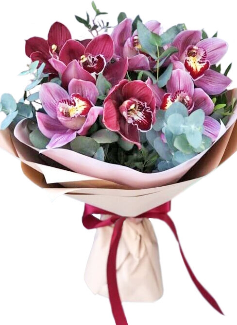 The bouquet of the majestic orchids with eucalyptus and/or other greeneries. The color of flowers can be from light pink to dark pink upon availability at the moment that yoiur order arrives.