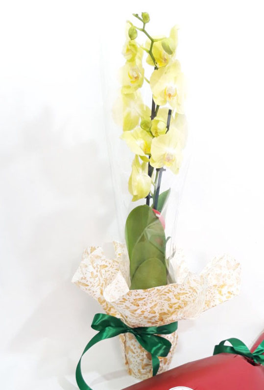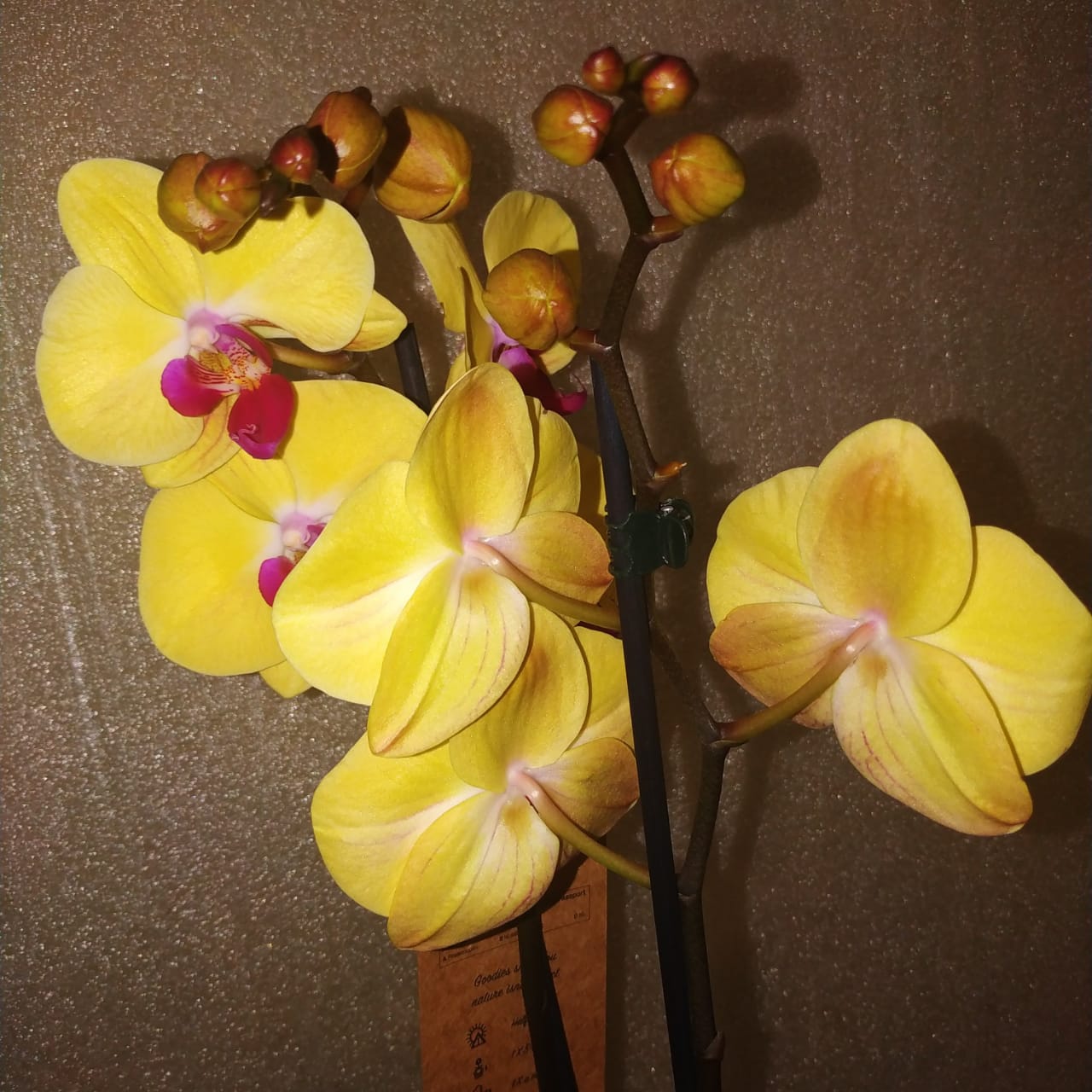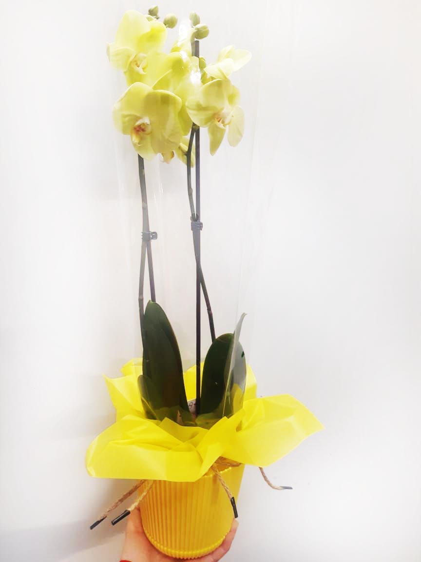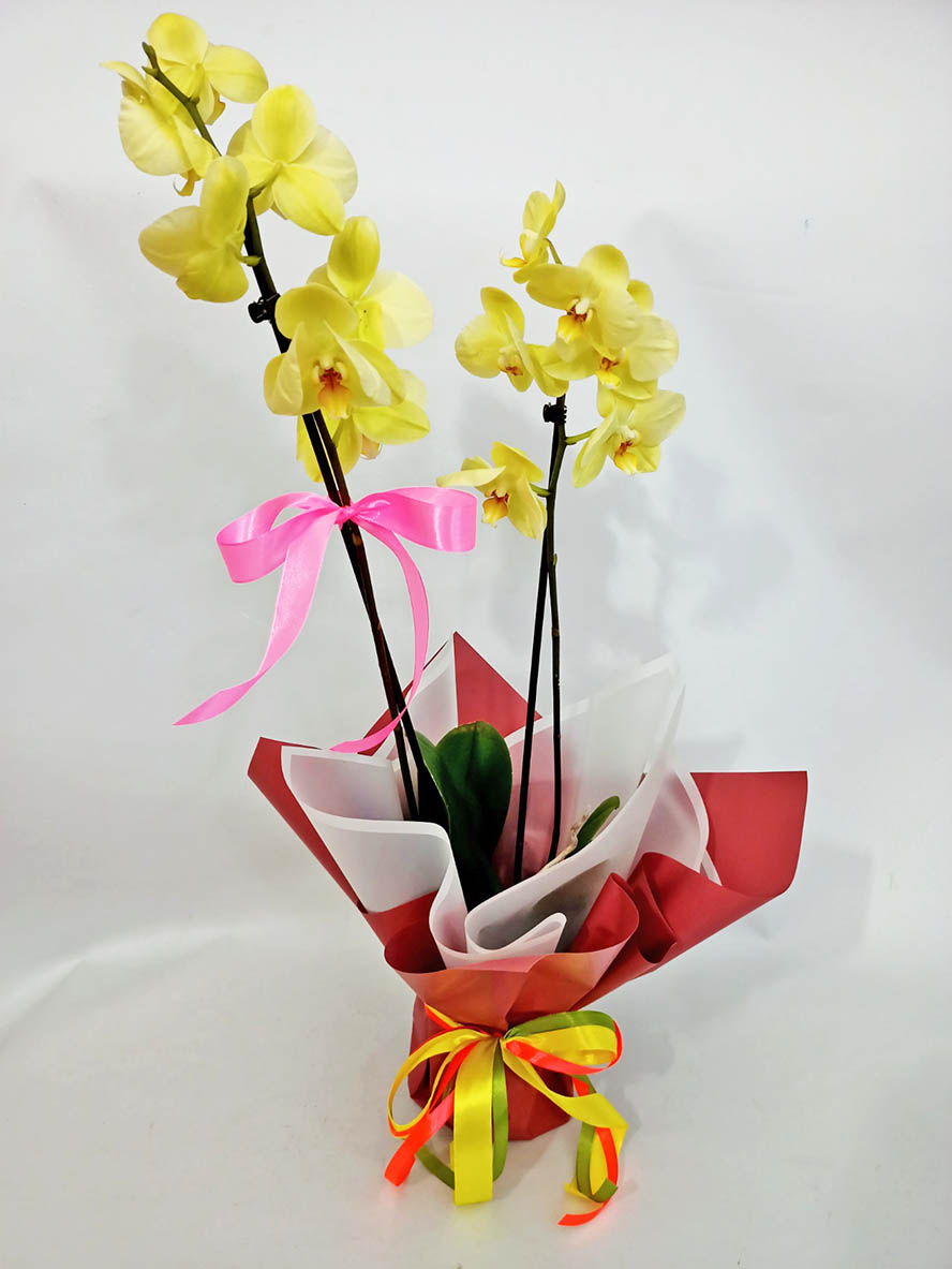 Yellow orchid with 2 flowering branches in a plastic conteiner