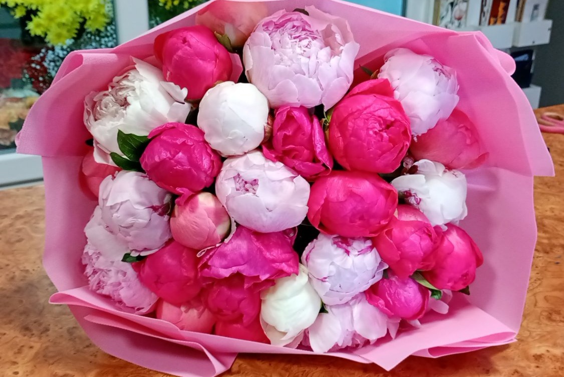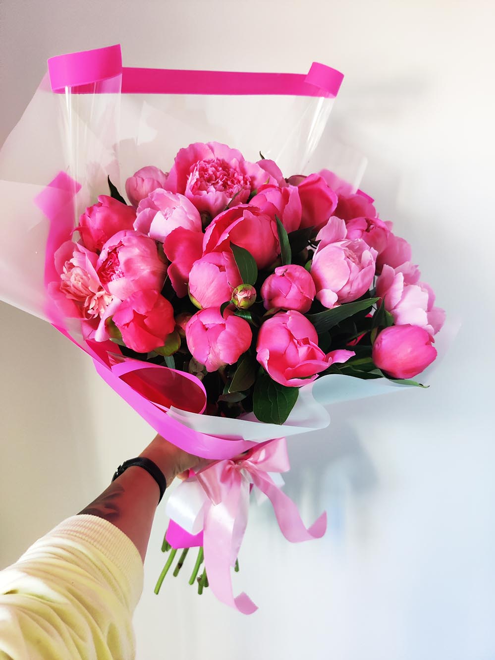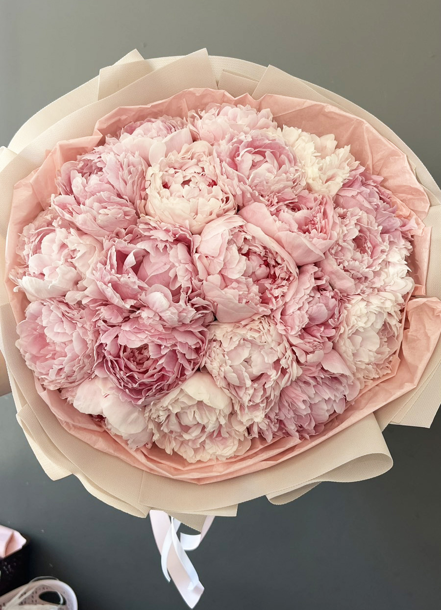 Our photo shows 25 from light to dark pink color peonies bouquet, but you could choose another number for your gift bouquet. Needelss to say, that bouquet will be packed for an impressive presentation to the receiver.