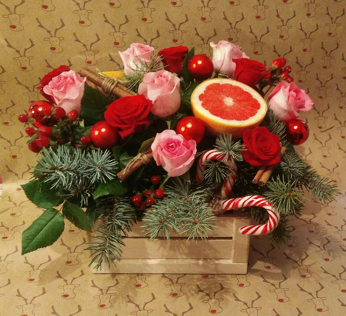 Composition is arranged at a wooden box like at our picture, or at the gift box, or at the basket (depends on the boxes selection at our flower shop at the moment)