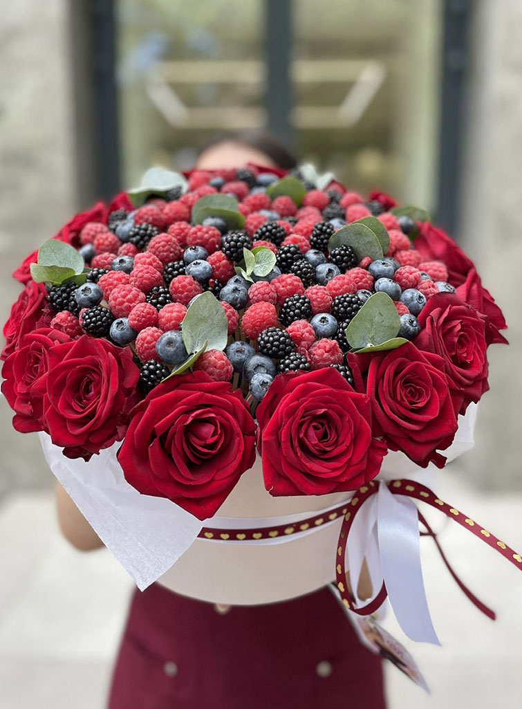 Our photo shows arrangement of 19 white roses with a set of mixed fruits and berries. However the size of the arrangement can be both bigger or smaller.