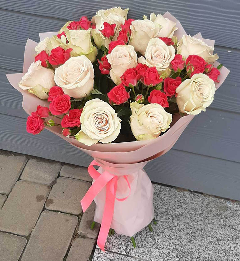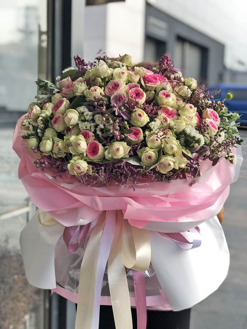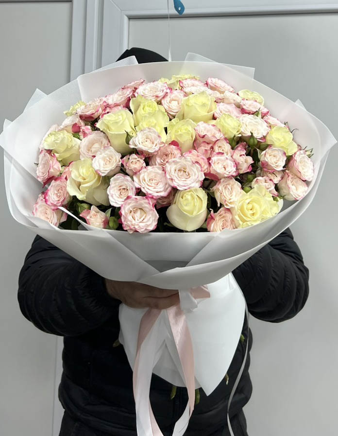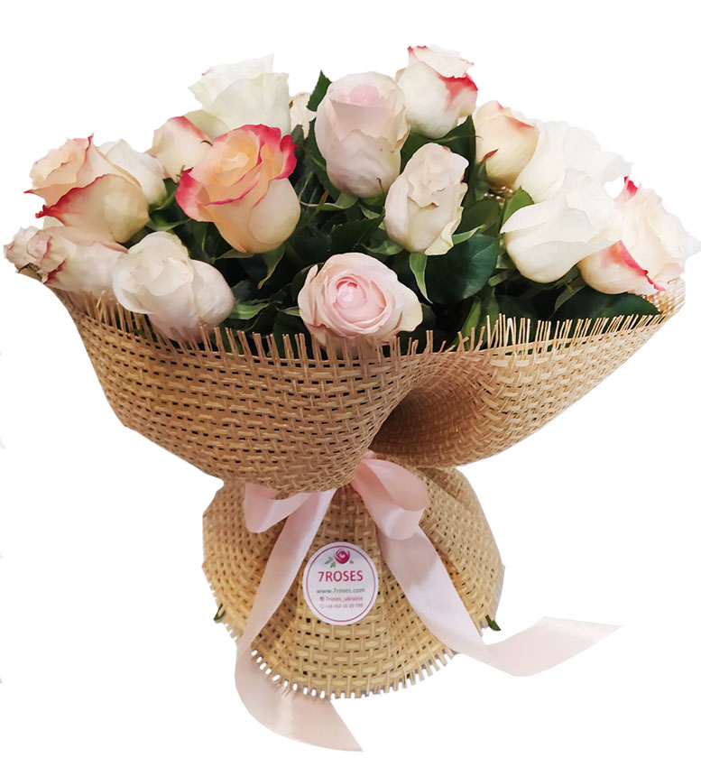 This amazingly tender and touching bouquet consists of Classic roses of light colors: white, light-pink, creamy…but all of them are close to white and the color variety can be hardly seen and becomes as one.