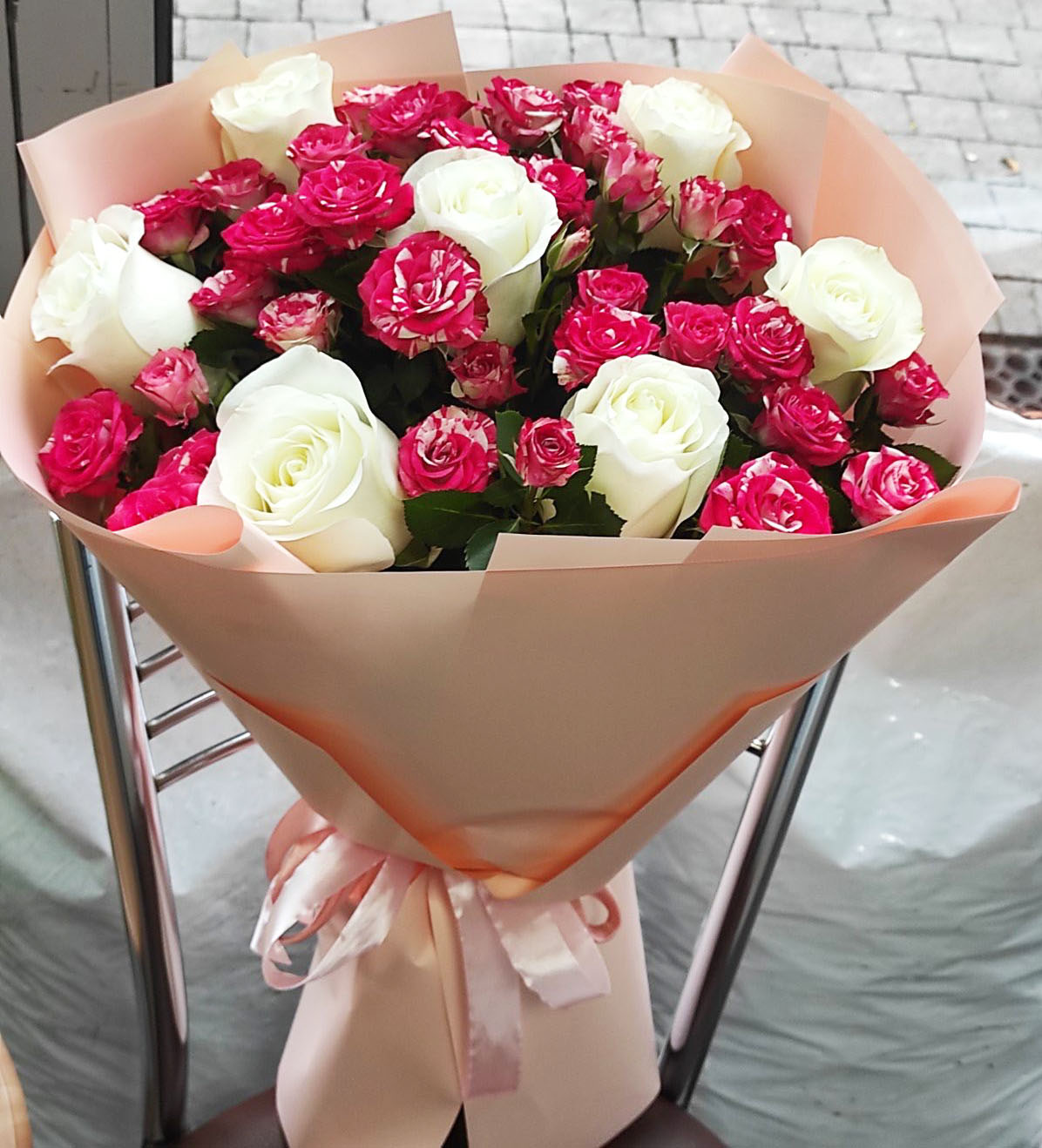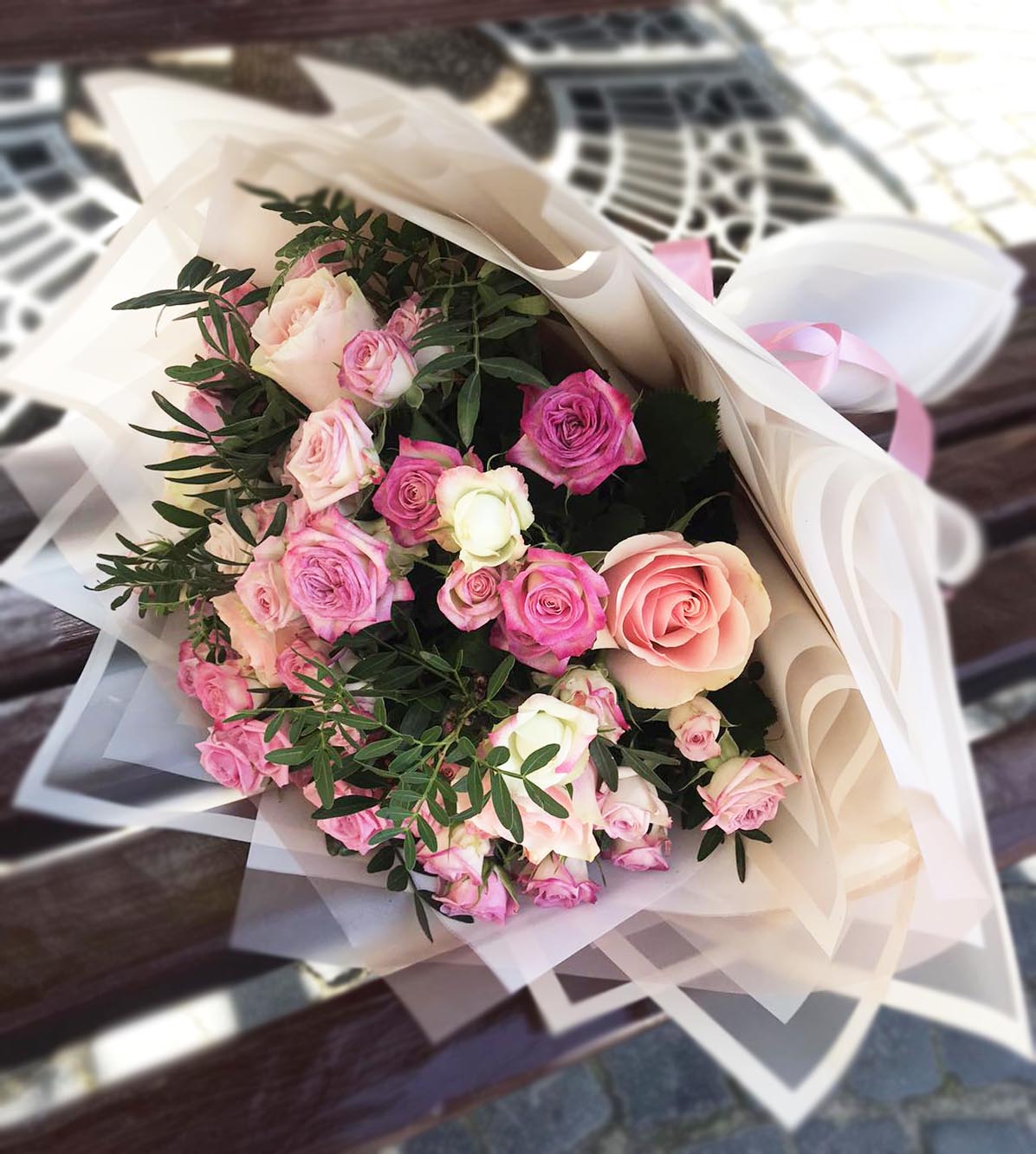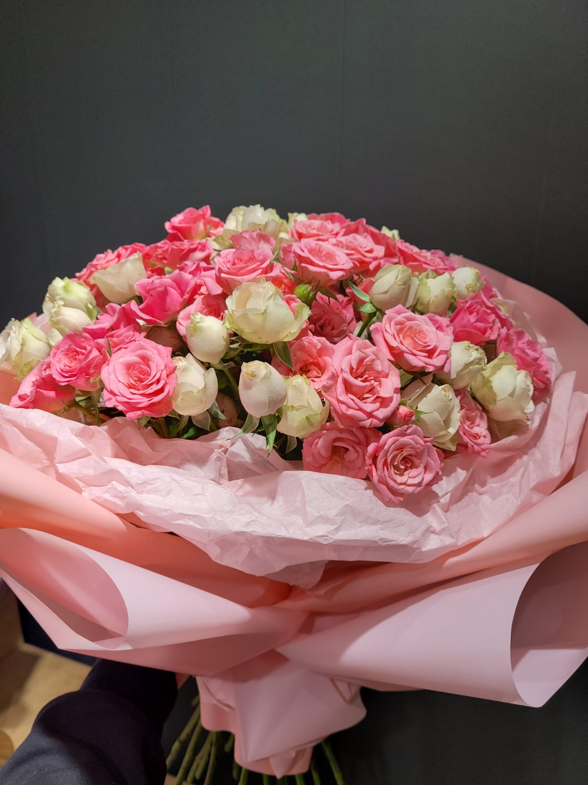 This amazingly tender and touching bouquet consists of Classic roses of light colors: white, light-pink, creamy…but all of them are close to white and the color variety can be hardly seen and becomes as one.