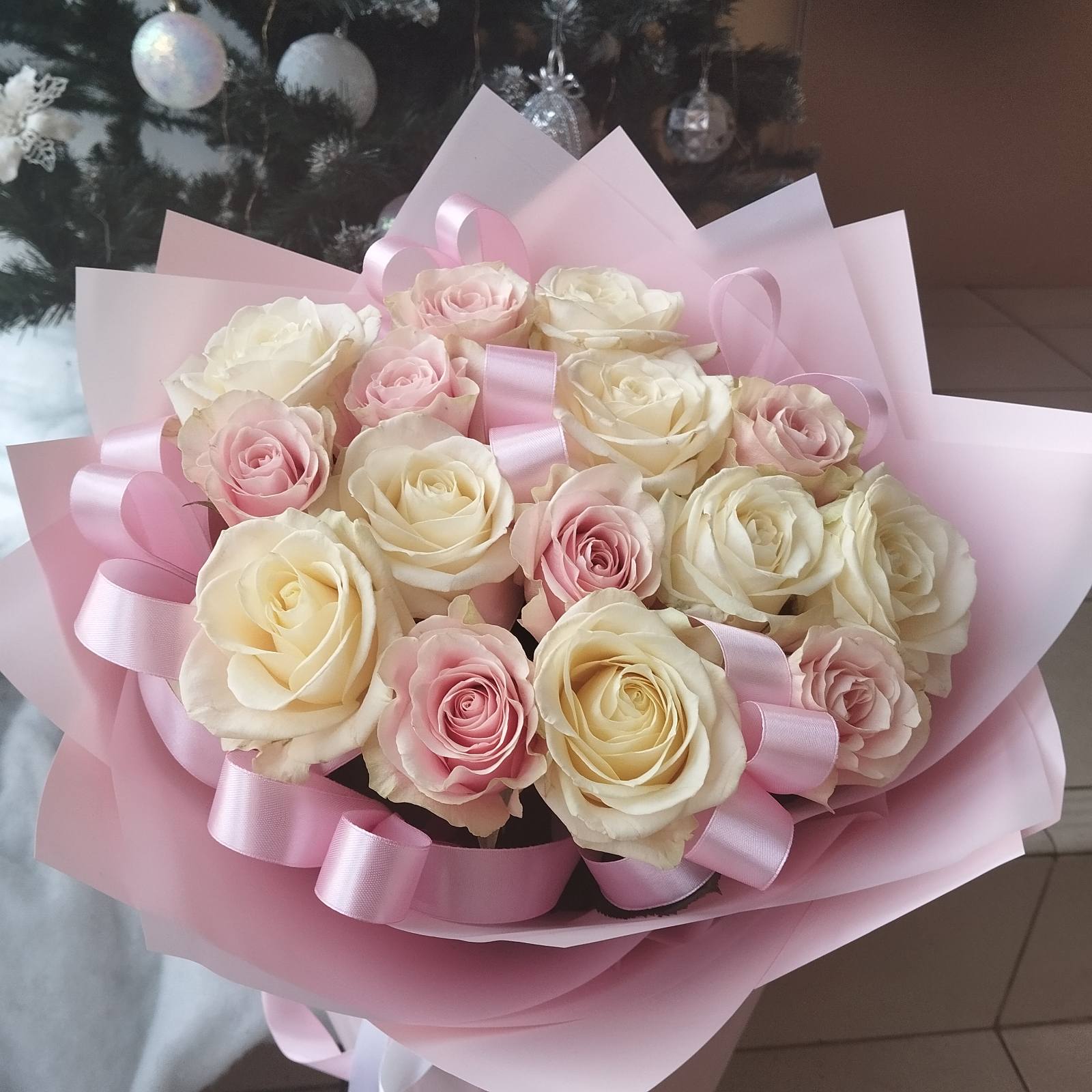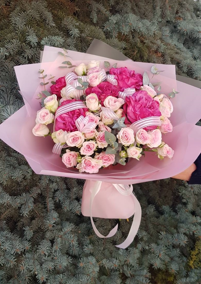 A round bouquet of Classic Roses of perfect style. The color gamma is harmonic in everything: color, shape, accompaniment and arrangement.