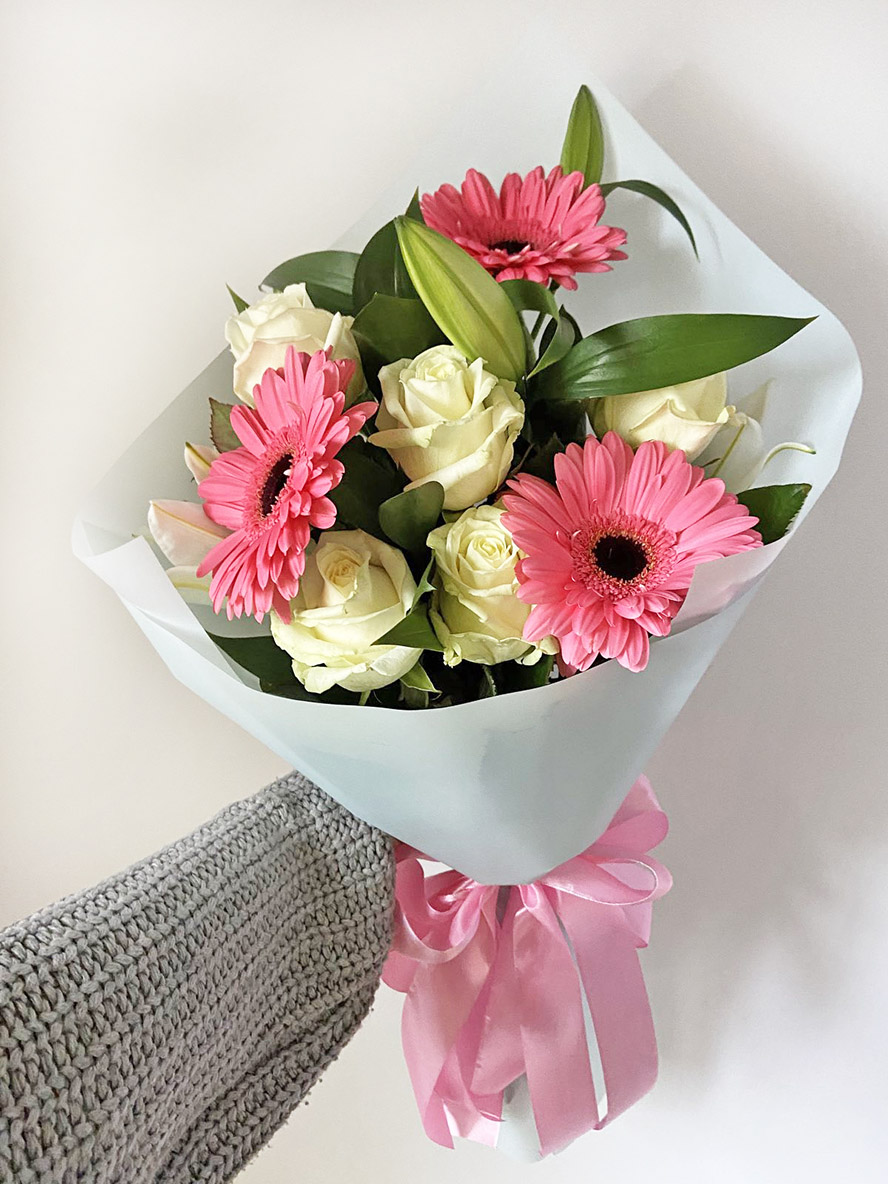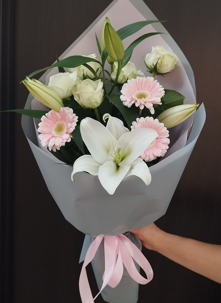 An elegant pink-pastel color bouquet of lilium, 5 roses, 3 pink gerberas or pink roses.