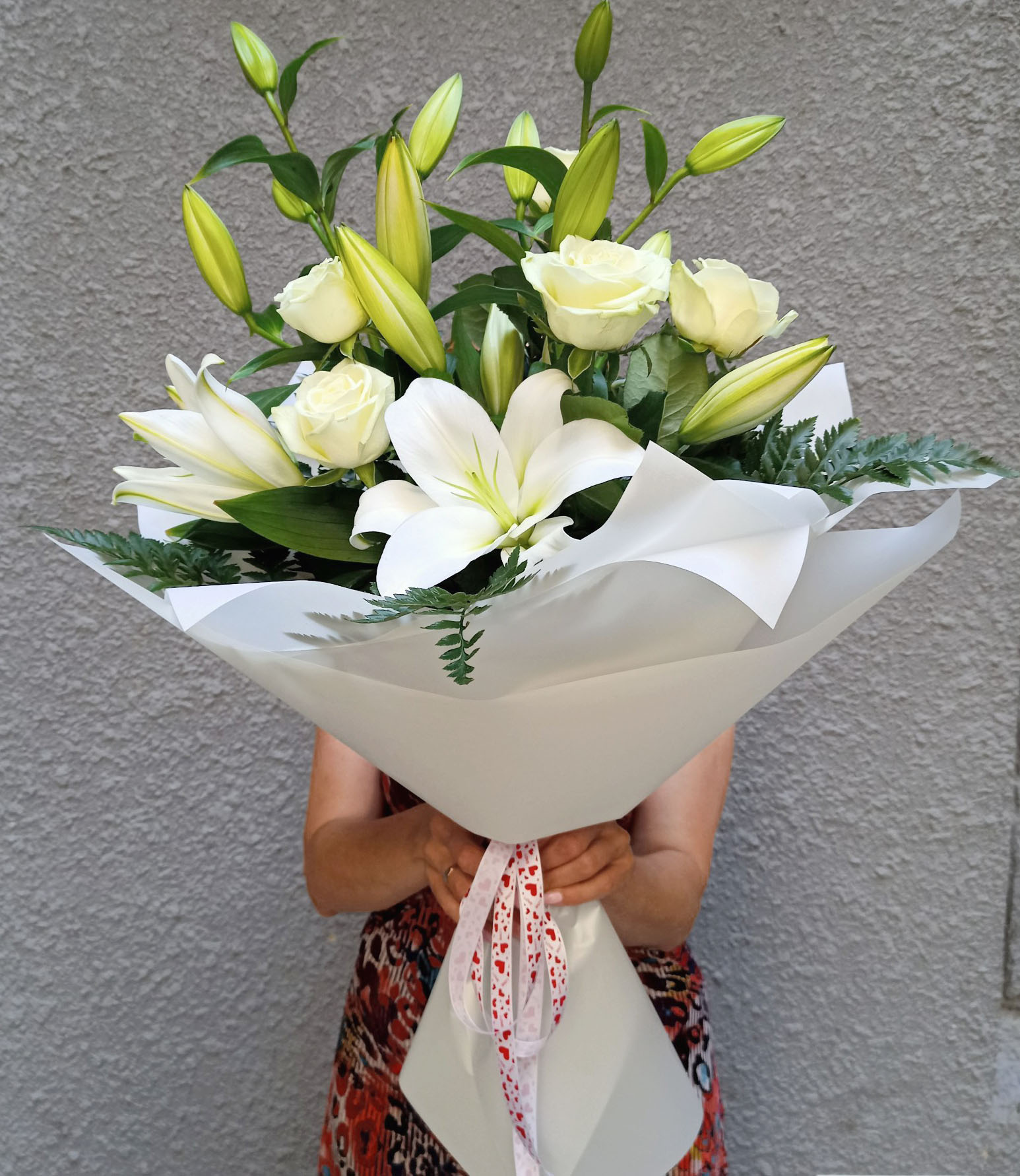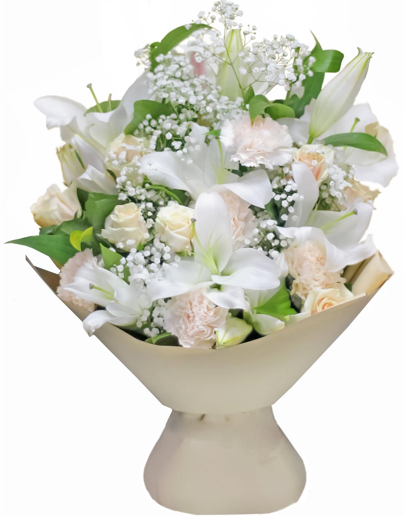 An elegant designed bouquet of Lily, Classic White roses and White (or Cream) carnations, fern with a silk stripe.