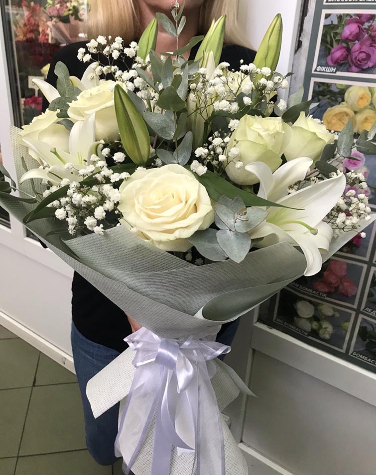 11 x snow-white Roses 3 bunches of Lilies