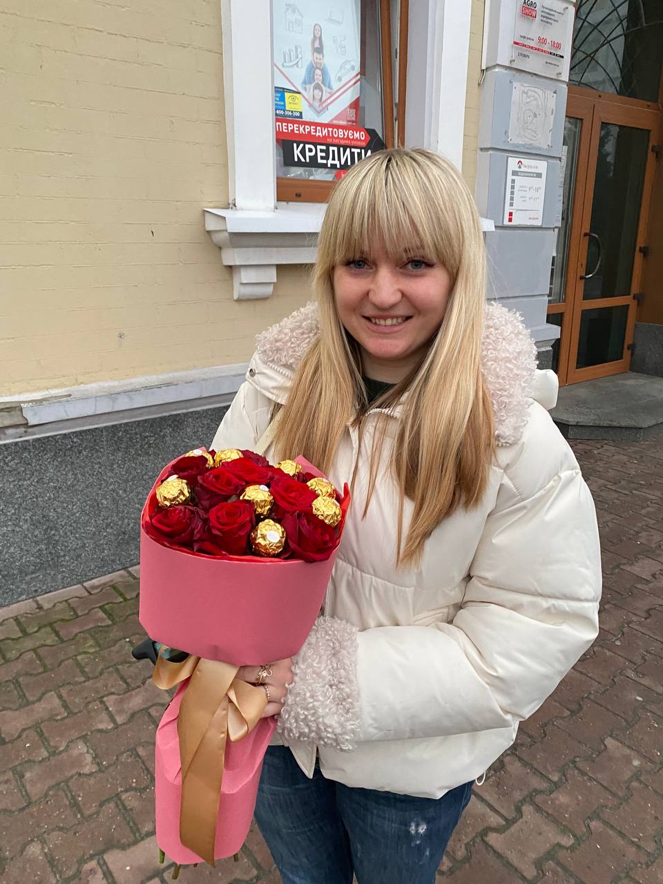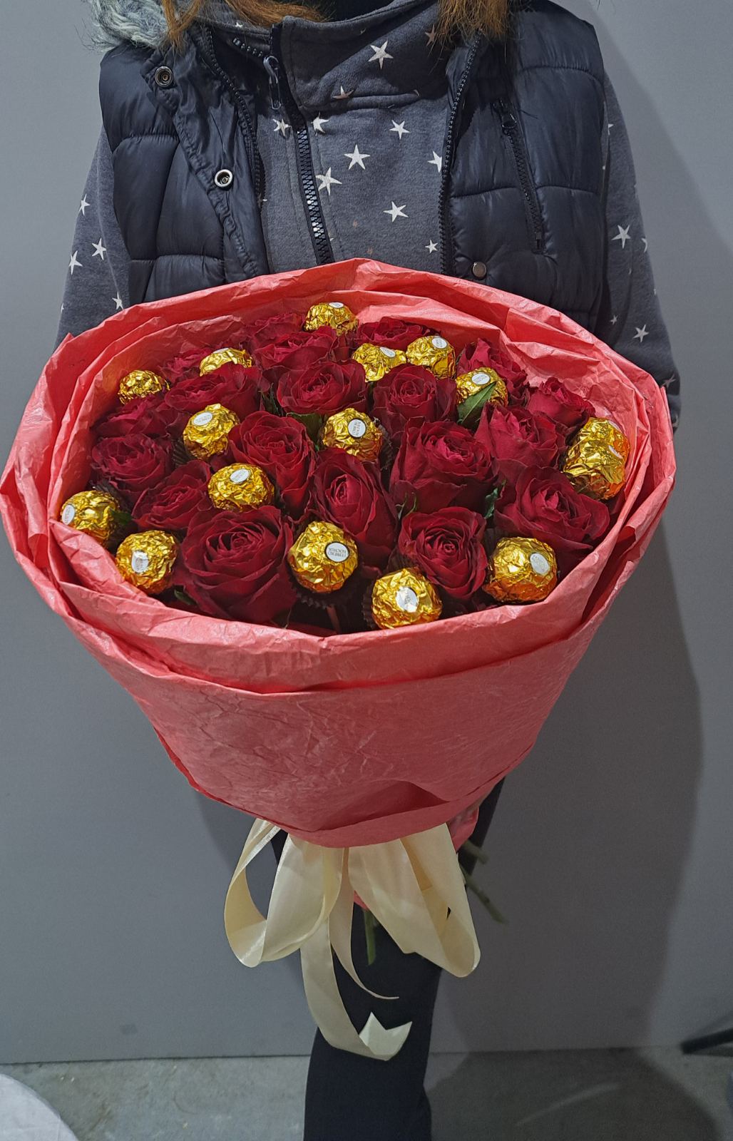 Our photo shows 15 roses +16 Ferreros bouquet, but you could order a smaller or a bigger one.