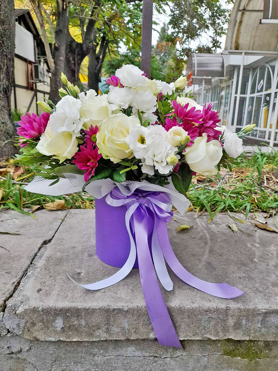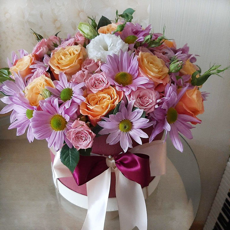 A Hat Box flower arrangement in pink, lilac and white tones at a hat-box looks really impressive.