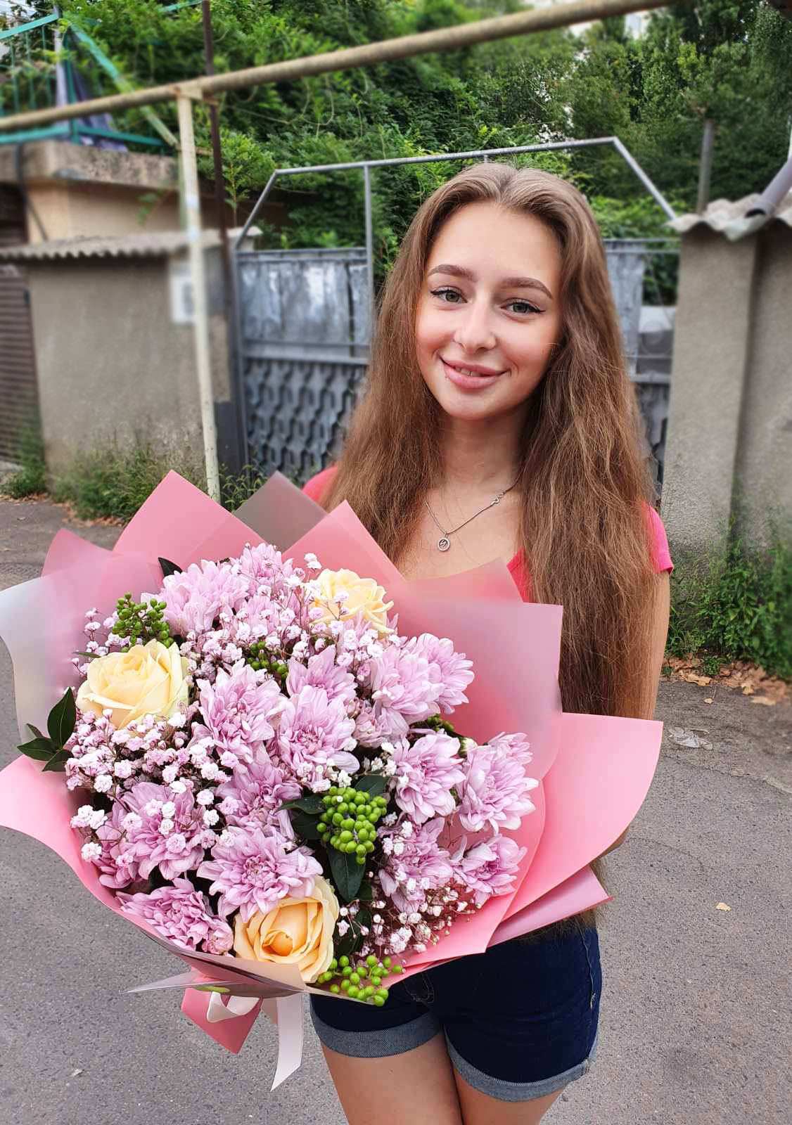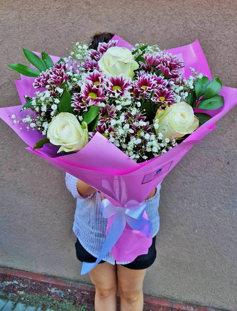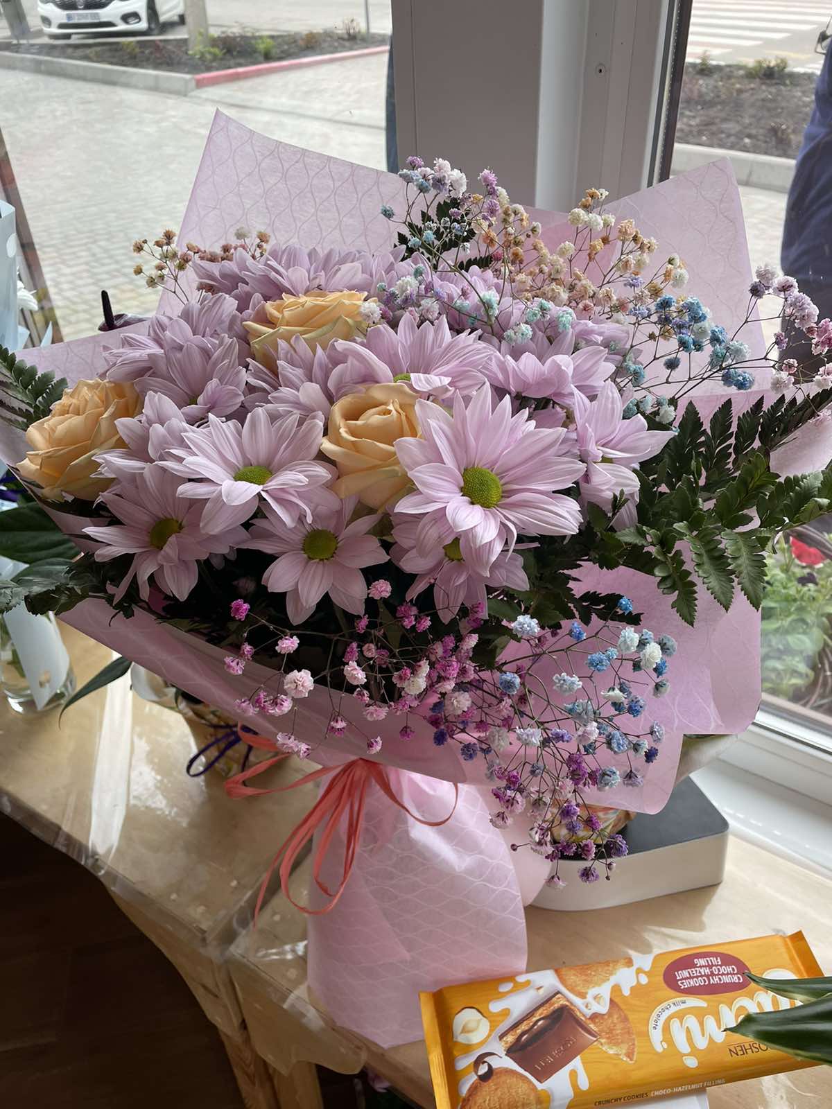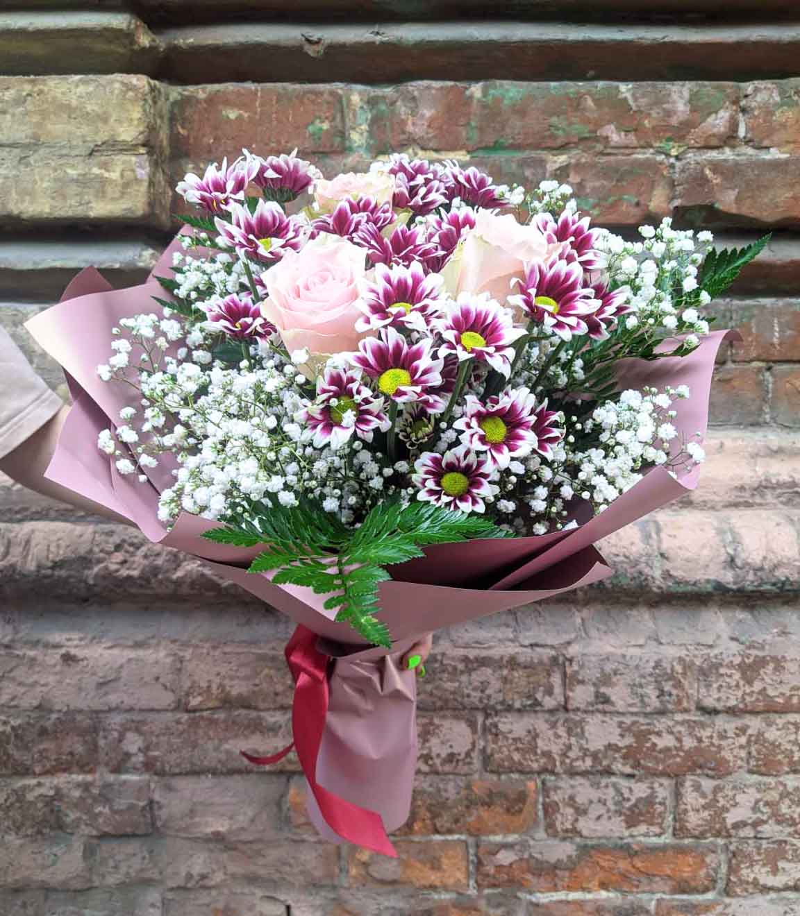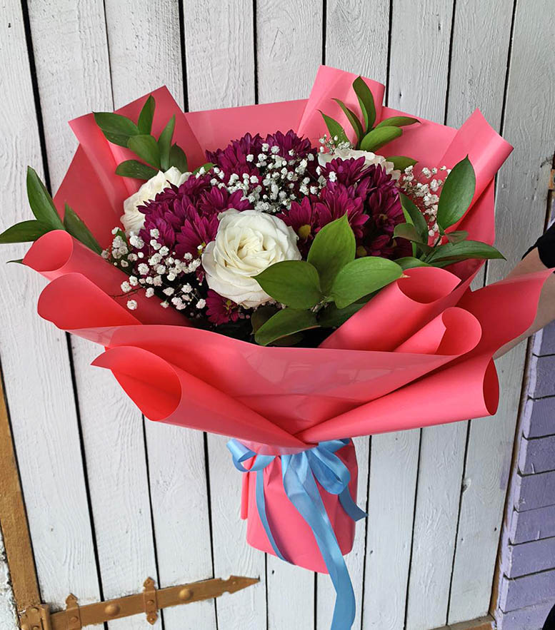 An inexpensive elegant bouquet of creamy roses and bright multicolored chrysanthemums A modern florist designing with lots of greenery, several branches of airy baby breath, nice wrapping. The bouquet is decorated with a beautiful bow