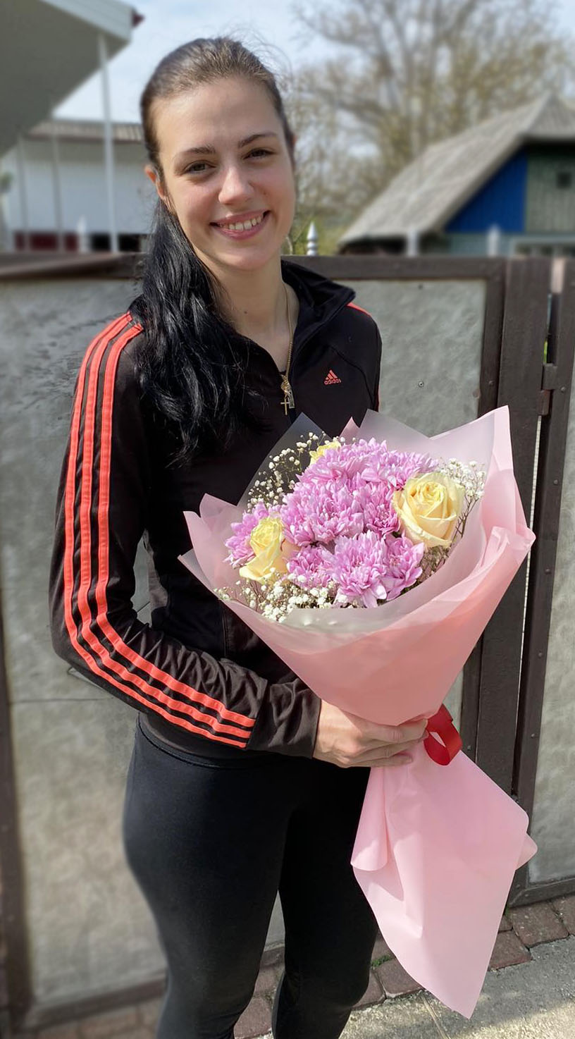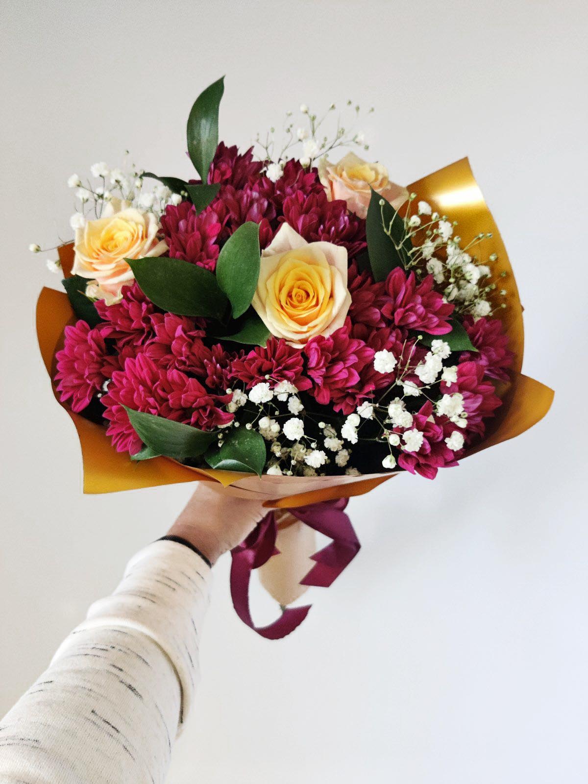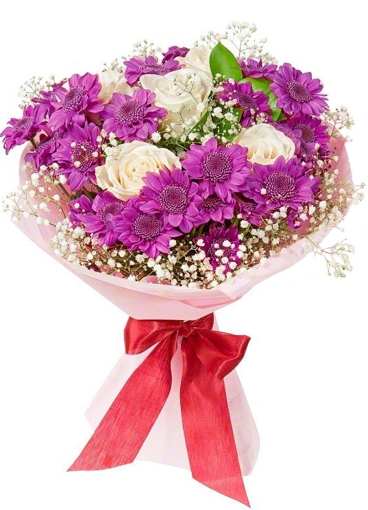 This bouquet at our photo is "Medium" option. It consists of 5 white or light peach roses, 5 violet chrysanthemums and ornamental foliage.