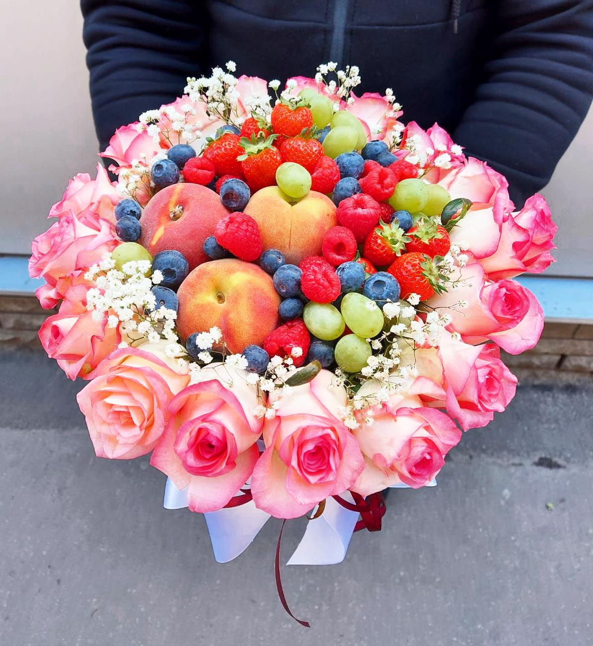 Our photo shows arrangement of 19 white roses with a set of mixed fruits and berries. However the size of the arrangement can be both bigger or smaller.