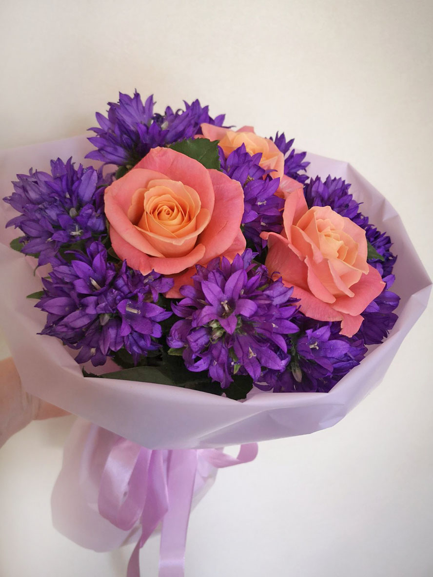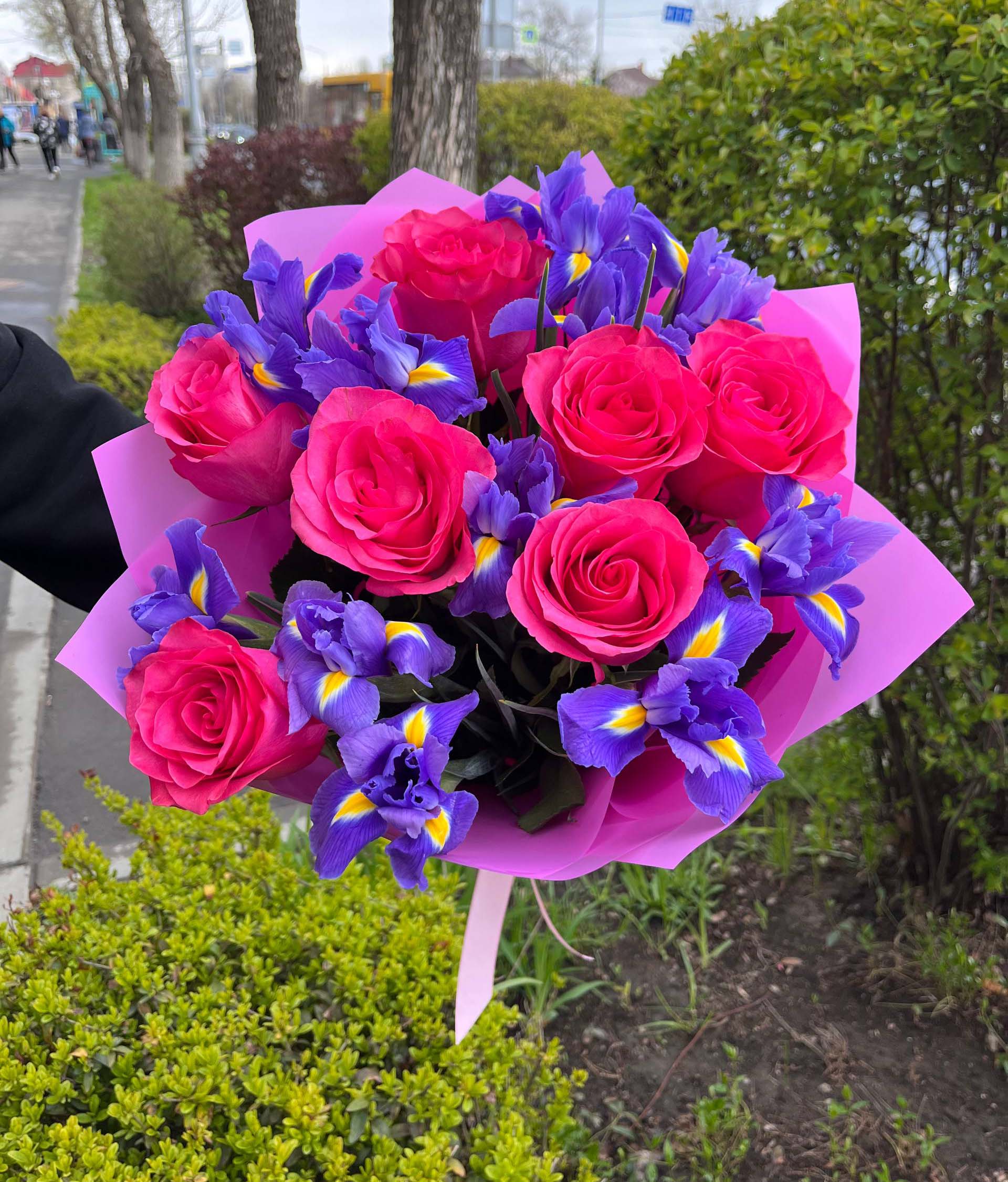 Original combination of pink and blue color flowers.... It can be either irises in a spring season like it is sjown at our photo, or blue eustoma, or... other blue or dark blue flowers that are available at the moment.