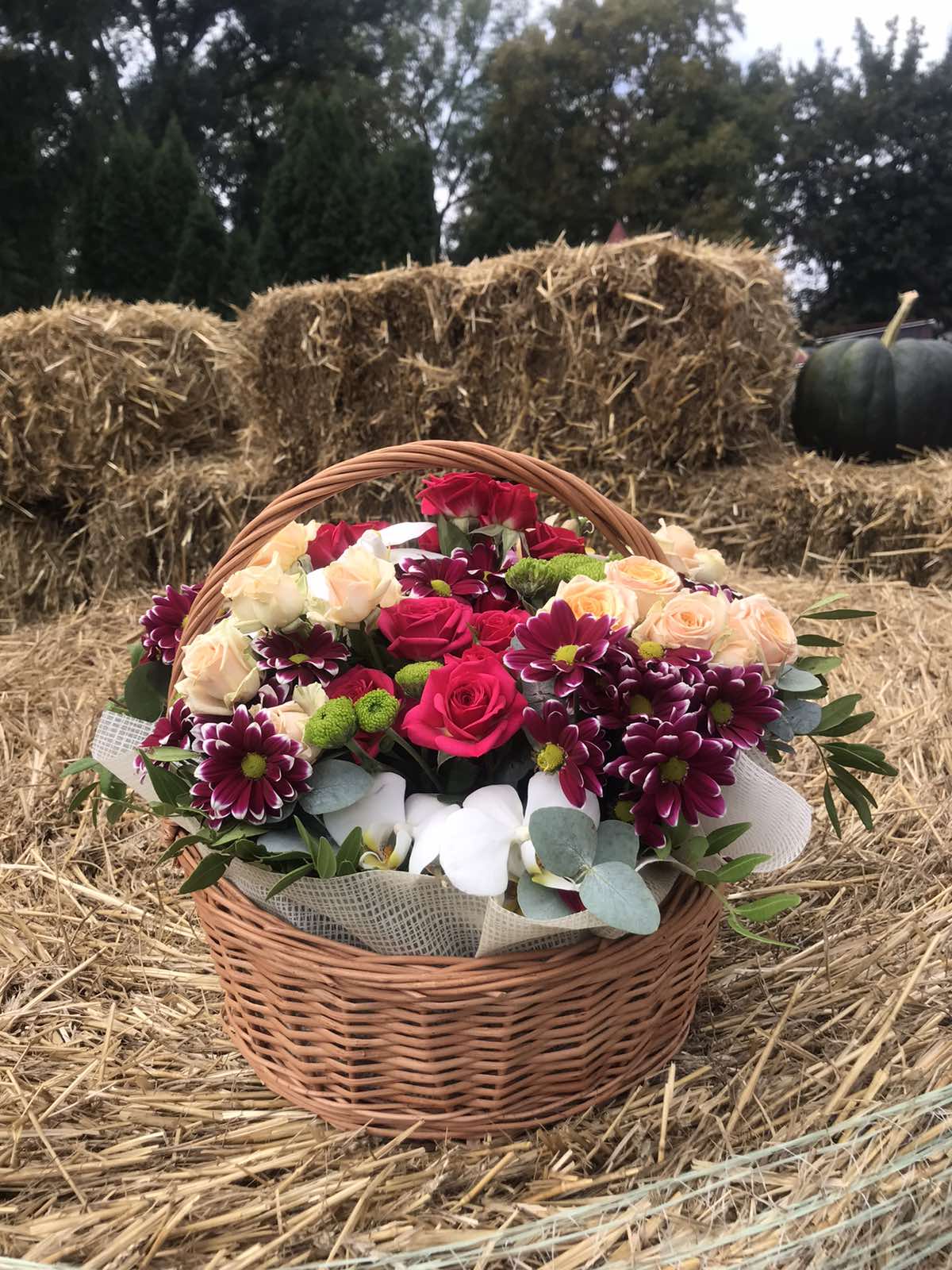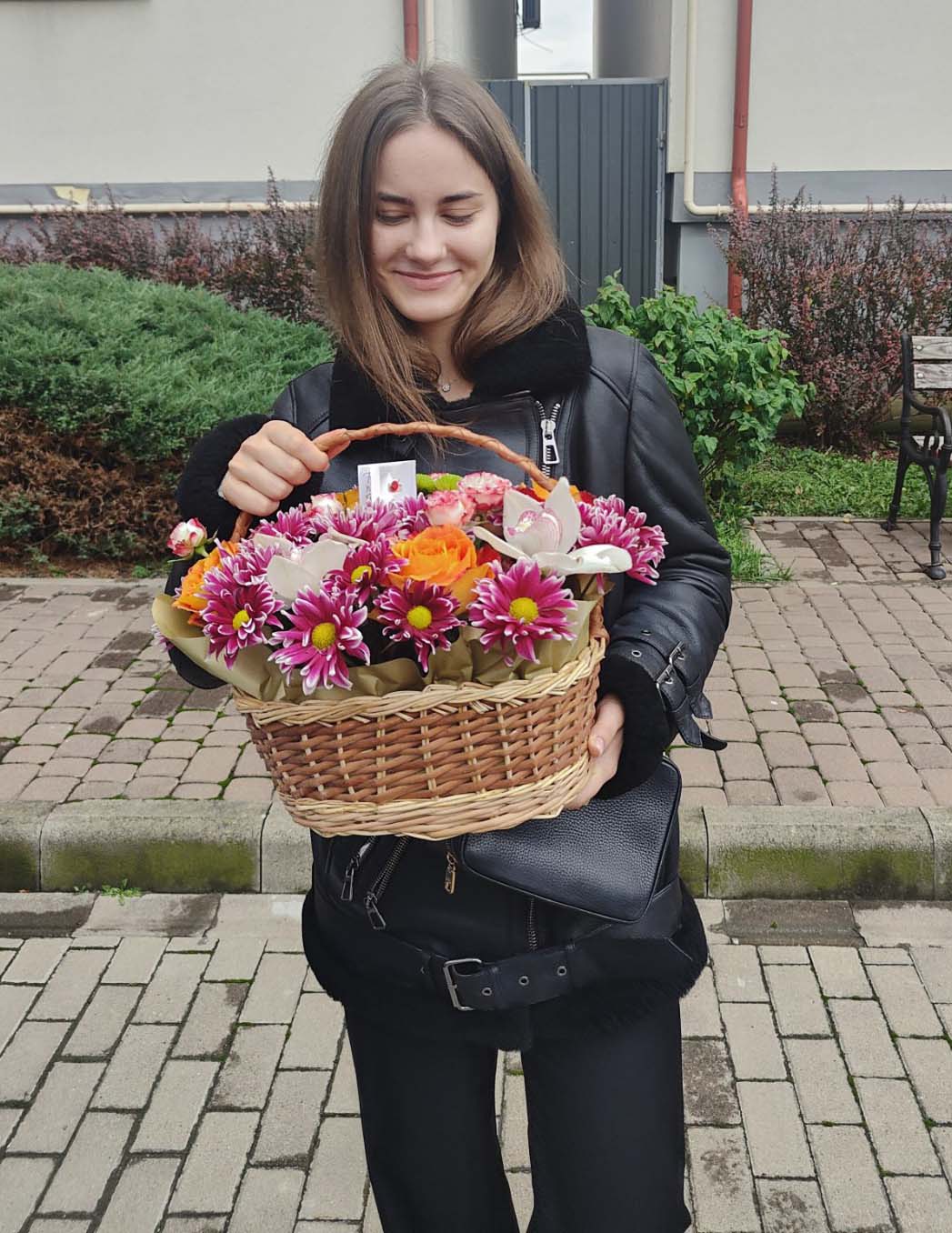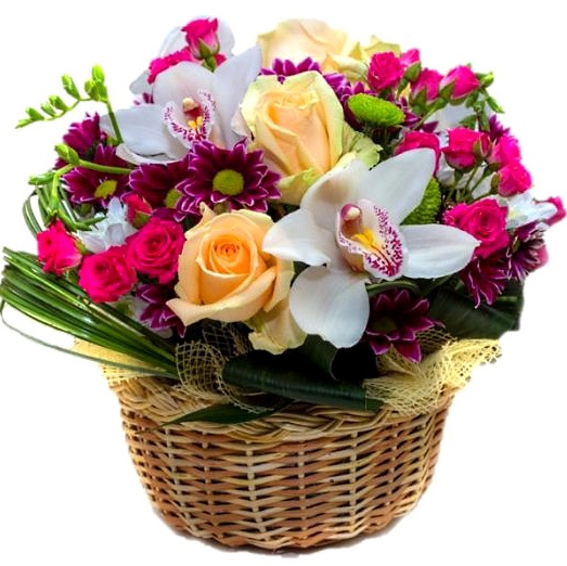 Arrangement can be made at a basket like it is shown at our main photo, but can be composed at a stylish hat box. It depends on the florist choice. Anyway it will be done as beautiful as possible.